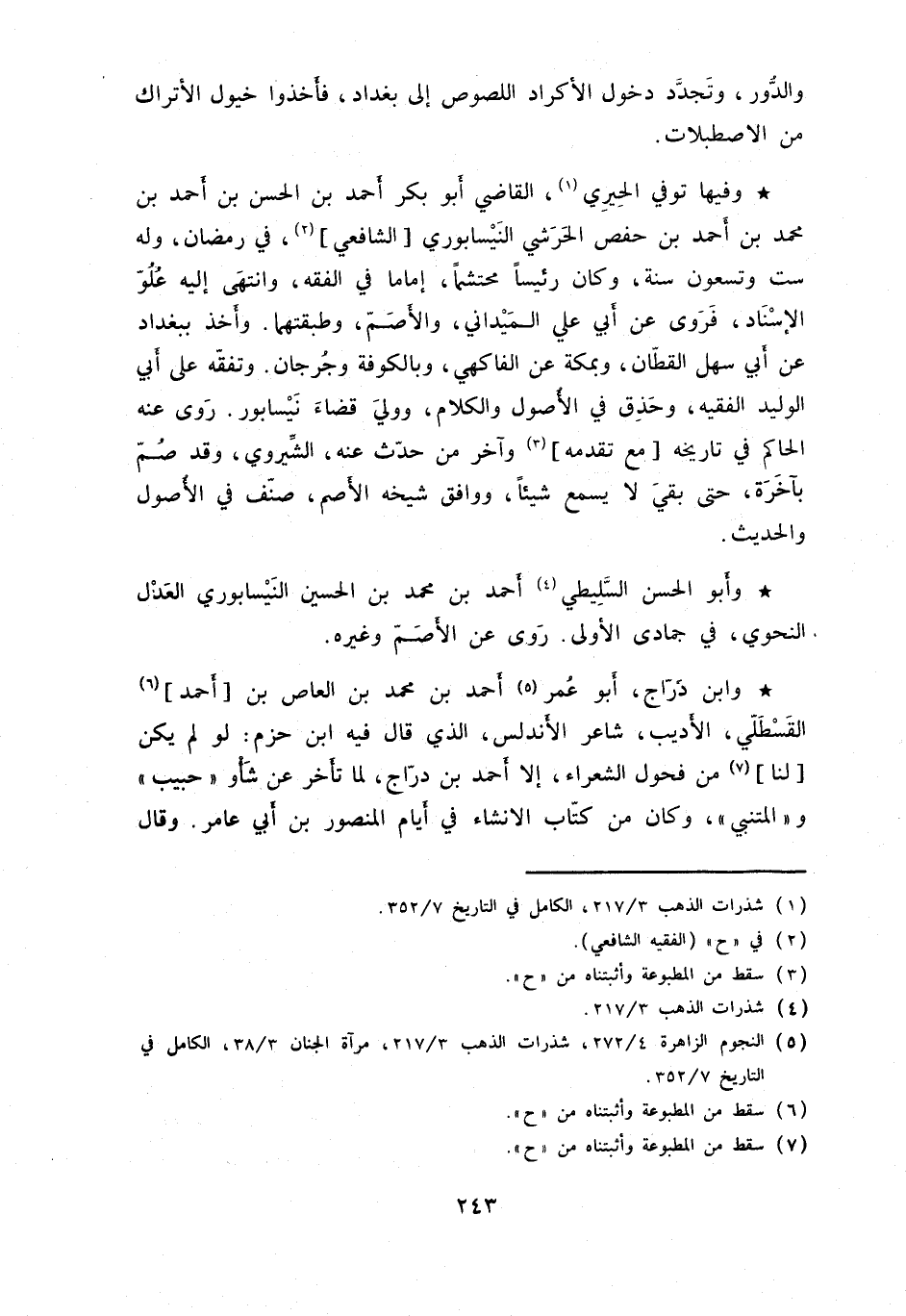 وفيها توفي الحيري، القاضي أبو بكر أحمد بن الحسن بن أحمد بن محمد بن أحمد بن حفص الحرشي النيسابوري الشافعي، في رمضان، وله ست وتسعون سنة، وكان رئيساً محتشماً، إماماً في الفقه، وانتهى إليه علوّ الإسناد، فروى عن أبي علي الميداني، والأصمّ، وطبقتهما. وأخذ ببغداد عن أبي سهل القطّان. وبمكة عن الفاكهي، وبالكوفة وجرجان. وتفقّه على أبي الوليد الفقيه، وحذق في الأصول والكلام، وولي قضاء نيسابور. روى عنه الحاكم في تاريخه مع تقدمه وآخر من حدّث عنه، الشِّيروي، وقد صمّ بآخرة، حتى بقي لا يسمع شيئاً، ووافق شيخه الأصم، صنّف في الأصول والحديث.