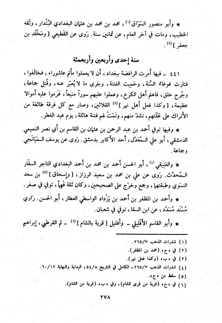 فيها أمرت الرافضة ببغداد، أن لا يعملوا مأتم عاشوراء، فخالفوا، فثارت غوغاء السنُّة، وحميت الفتنة، وجرى مالا يعبّر عنه، وقتل جماعة، وجرح خلق، فاهتم أهل الكرخ، وعلموا عليهم سوراً منيعاً، غرموا عليه أموالاً عظيمة، وكذا فعل أهل نهر القلائين، وصار مع كل فرقة طائفة من الأتراك على نحلتهم، تشدّ منهم، وتمّت لهم فتنة هائلة، يوم عيد الفطر.