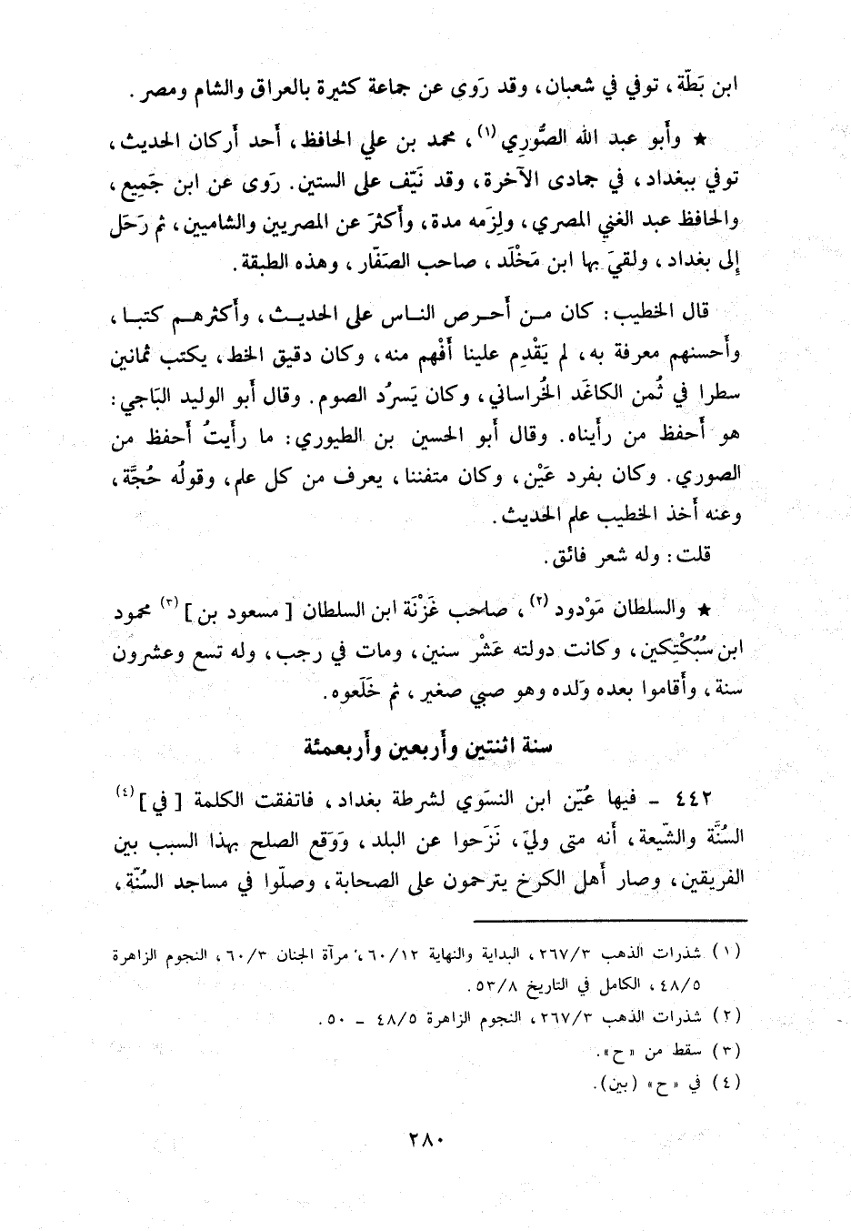 فيها عيّن ابن النسوي لشرطة بغداد، فاتفقت الكلمة في السنَّة والشّيعة، أنه متى ولي، نزحوا عن البلد، ووقع الصلح بهذا السبب بين الفريقين، وصار أهل الكرخ يترحمون على الصحابة، وصلّوا في مساجد السنّة،