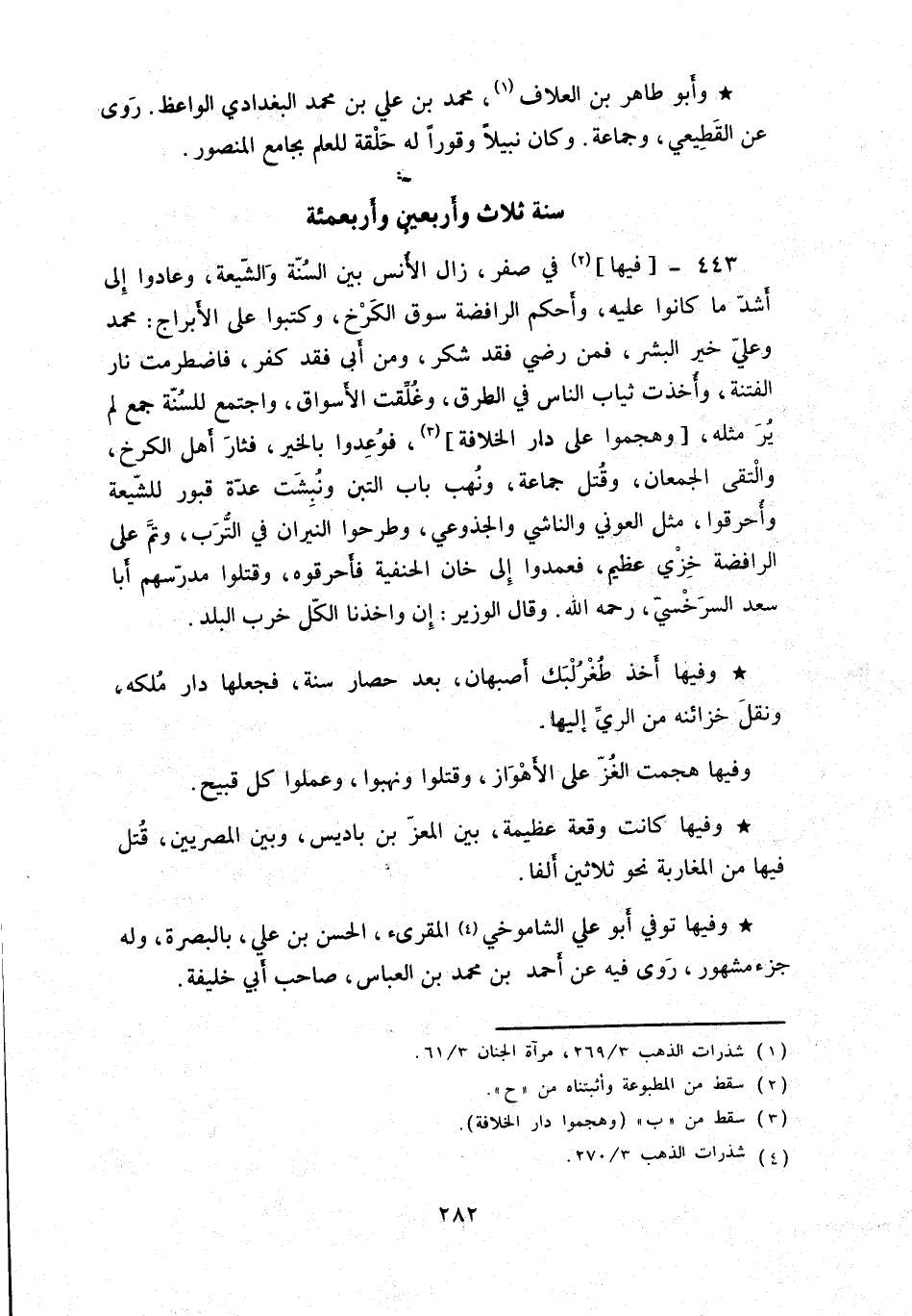 فيها في صفر، زال الأنس بين السنّة والشّيعة، وعادوا إلى أشدّ ما كانوا عليه، وأحكم الرافضة سوق الكرخ، وكتبوا على الأبراج: محمد وعليّ خير البشر، فمن رضي فقد شكر، ومن أبى فقد كفر، فاضطرمت نار الفتنة، وأخذت ثياب الناس في الطرق، وغلِّقت الأسواق، واجتمع للسنّة جمع لم ير مثله، وهجموا على دار الخلافة، فوعدوا بالخير، فثار أهل الكرخ، والتقى الجمعان، وقتل جماعة، ونهب باب التبن ونبشت عدّة قبور للشّيعة وأحرقوا، مثل العوني والناشي والجذوعي، وطرحوا النيران في التُّرب، وتمَّ على الرافضة خزي عظيم، فعمدوا إلى خان الحنفية فأحرقوه، وقتلوا مدرّسهم أبا سعد السرخسيّ، رحمه الله. وقال الوزير: إن وأخذنا الكّل خرب البلد.