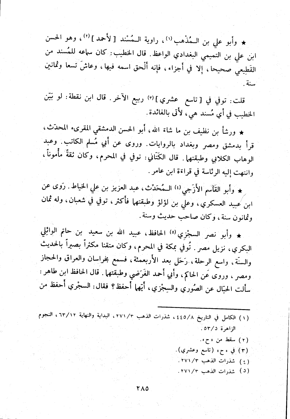 وأبو نصر السجزي الحافظ، عبيد الله بن سعيد بن حاتم الوائلي البكري، نزيل مصر. توفي بمكة في المحرم، وكان متقناً مكثراً بصيراً بالحديث والسنّة، واسع الرحلة، رحل بعد الأربعمئة، فسمع بخراسان والعراق والحجاز ومصر، وروى عن الحاكم، وأبي أحمد الفرضي وطبقتهما. قال الحافظ ابن طاهر: سألت الحبّال عن الصوري والسجزي، أيّهما أحفظ؟ فقال: السجري أحفظ من