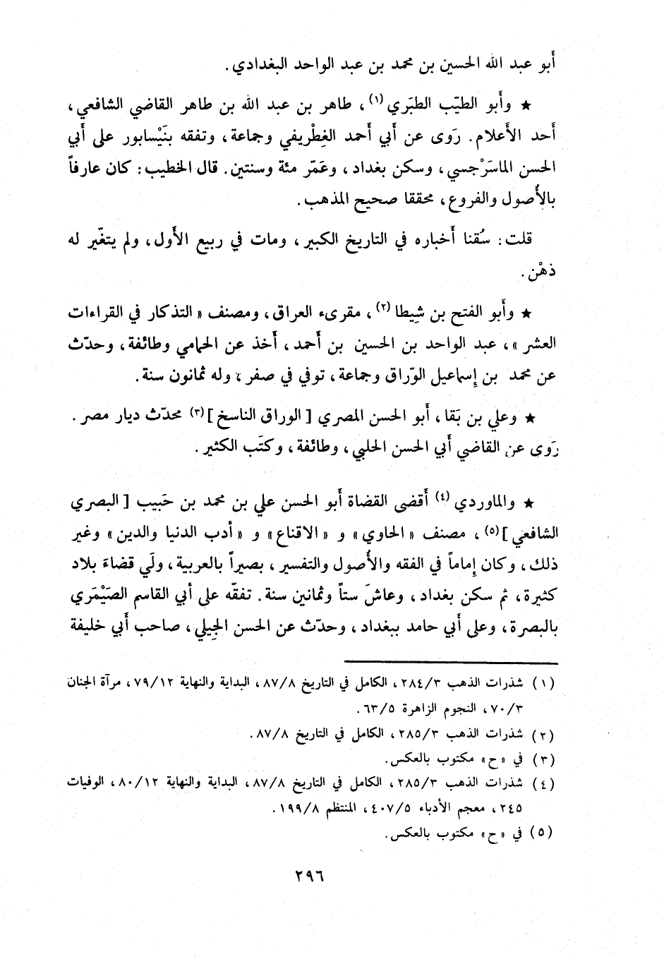 وأبو الطّيب الطبري، طاهر بن عبد الله بن طاهر القاضي الشافعي، أحد الأعلام. روى عن أبي أحمد الغطريفي وجماعة، وتفقه بنيسابور على أبي الحسن الماسرجسي، وسكن بغداد، وعمرّ مئة وسنتين: قال الخطيب: كان عارفاً بالأصول والفروع، محققاً صحيح المذهب.