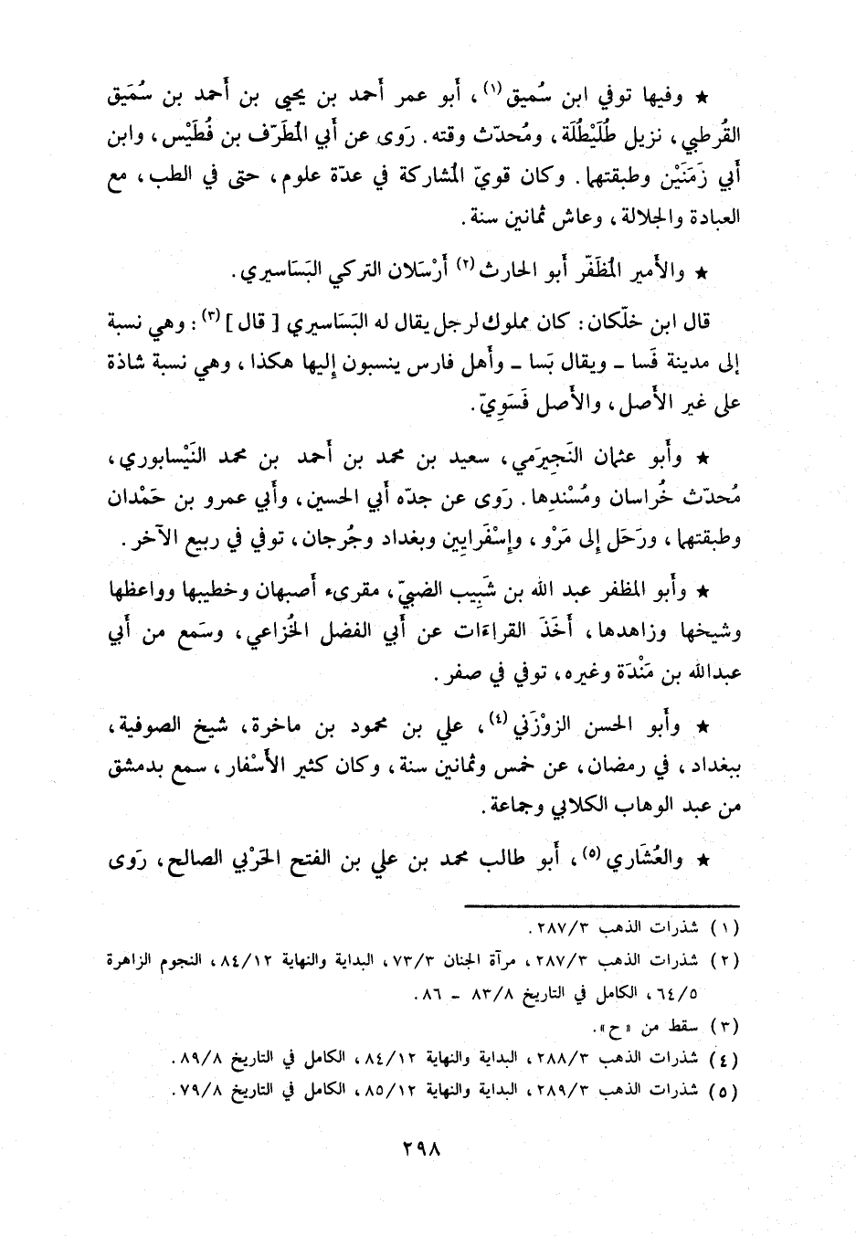 وأبو الحسن الزوزني، علي بن محمود بن ماخرة، شيخ الصوفية، ببغداد، في رمضان، عن خمس وثمانين سنة، وكان كثير الأسفار، سمع بدمشق من عبد الوهاب الكلابي وجماعة.