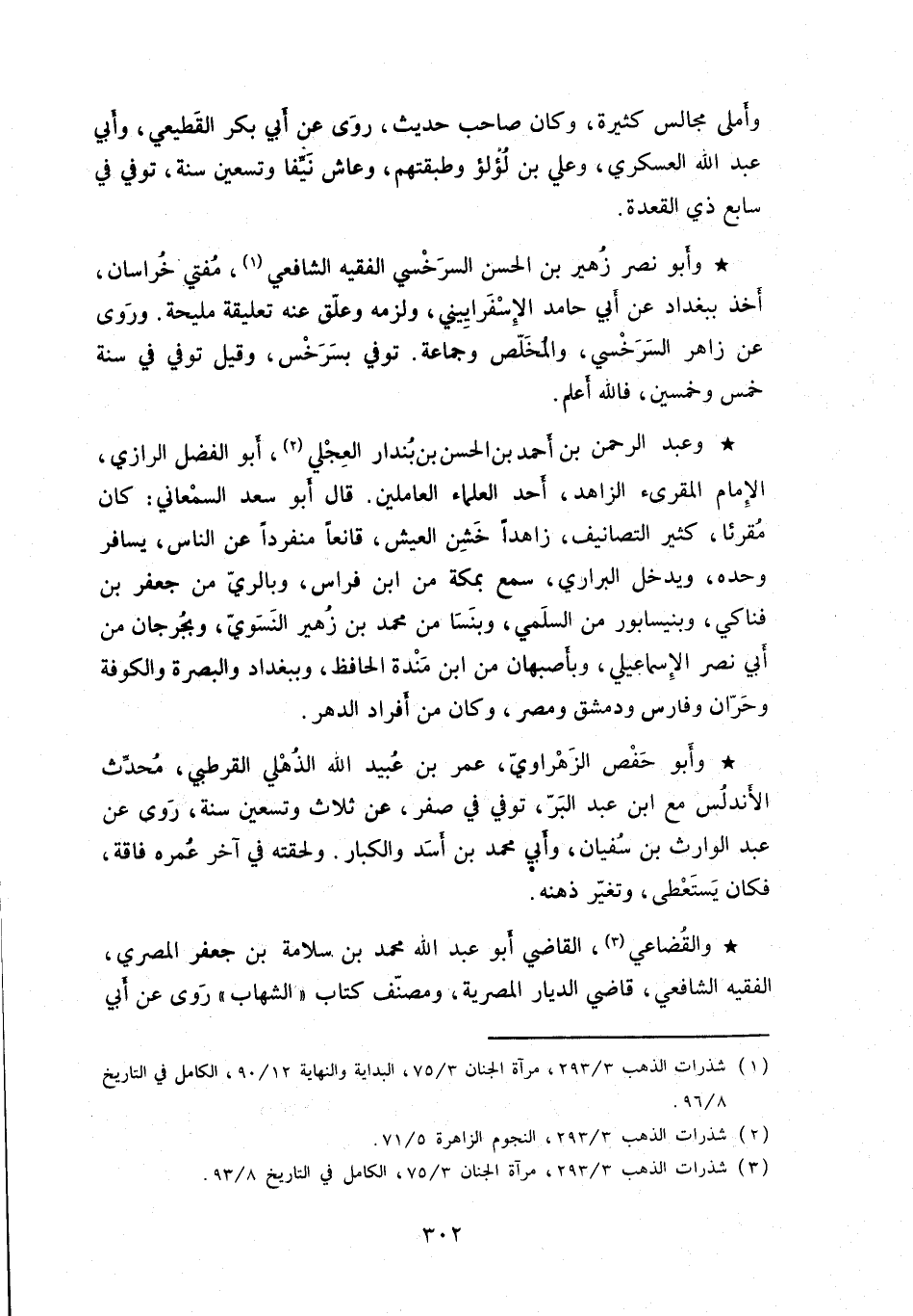 وابو نصر زهير بن الحسين السرخسي الفقيه الشافعي، مفتي خراسان، أخذ ببغداد عن أبي حامد الإسفراييني، ولزمه وعلّق عنه تعليقه مليحة. وروى عن زاهر السرخسي، والمخلّص وجماعة. توفي بسرخس، وقيل توفي في سنة خمس وخمسين، فالله أعلم.