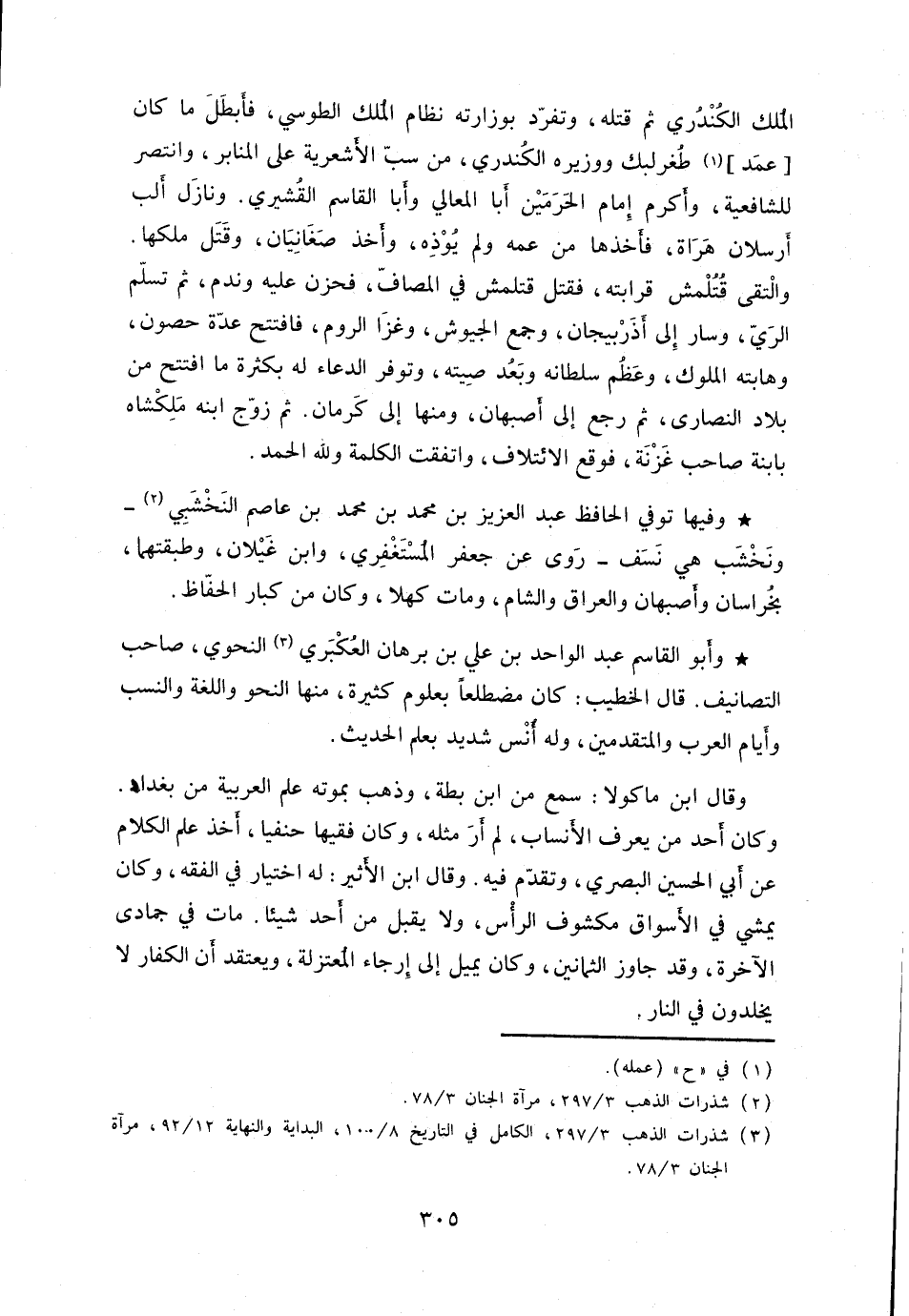 وكان أحد من يعرف الأنساب، لم أر مثله، وكان فقيهاً حنفياً، أخذ علم الكلام عن أبي الحسين البصري، وتقدّم فيه. وقال ابن الأثير: له اختيار في الفقه، وكان يمشي في الأسواق مكشوف الرأس، ولا يقبل من أحد شيئاً. مات في جمادى الآخرة، وقد جاوز الثمانين، وكان يميل إلى إرجاء المعتزلة، ويعتقد أن الكفار لا يخلدون في النار.
