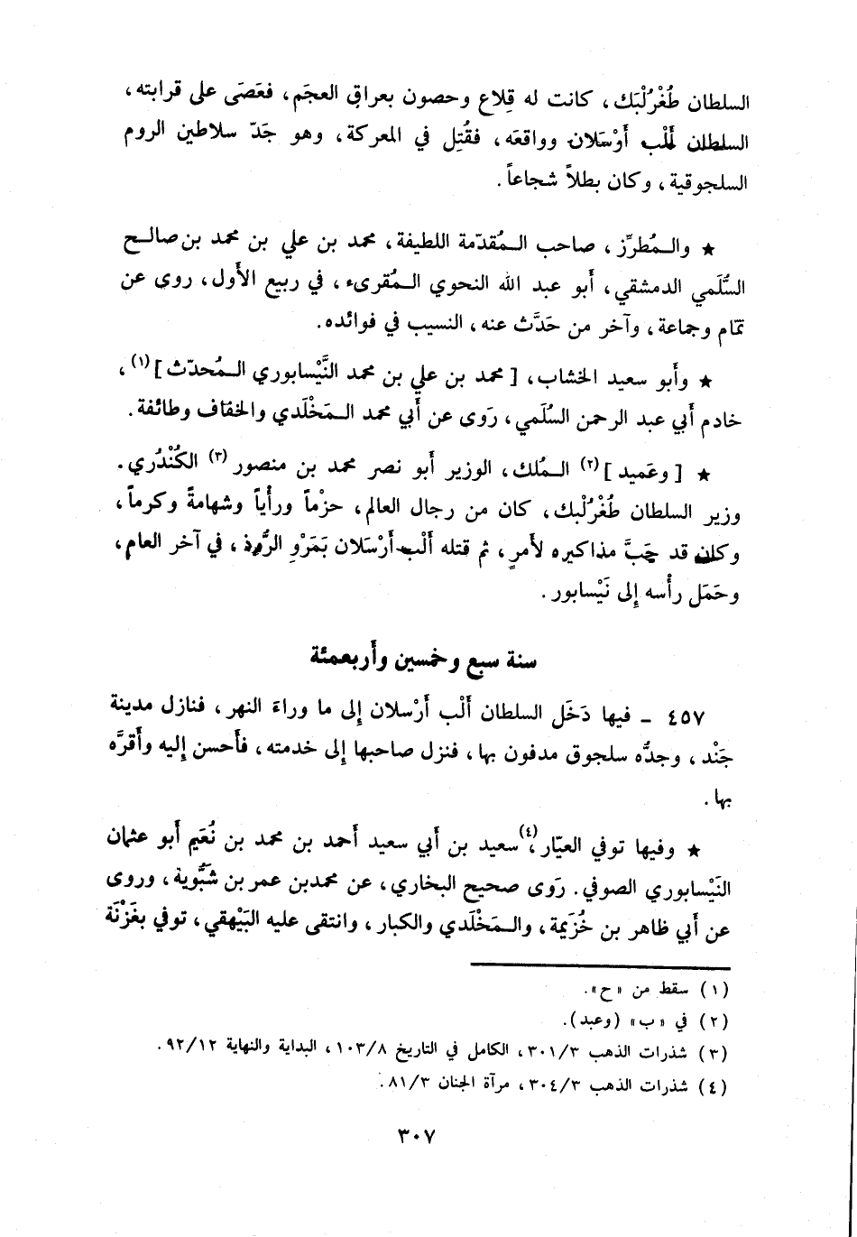وعميد الملك، الوزير أبو نصر محمد بن منصور الكندري. وزير السلطان طغرلبك، كان من رجال العالم، حزماً ورأياً وشهامةً وكرماً، وكان قد حيَّ مذاكيره لأمرٍ، ثم قتله ألب أرسلان بمرو الرُّوذ، في آخر العام، وحمل رأسه إلى نيسابور.