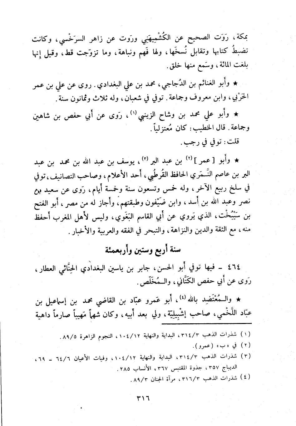 وابو عمر بن عبد البر، يوسف بن عبد الله بن محمد بن عبد البر بن عاصم النَّمري الحافظ القرطبي، أحد الأعلام، وصاحب التصانيف، توفي في سلخ ربيع الآخر، وله خمس وتسعون سنة وخمسة أيام، روى عن سعيد بن نصر وعبد الله بن أسد، وابن ضيفون وطبقتهم، وأجاز له من مصر، أبو الفتح بن سيبخت، الذي يروي عن أبي القاسم البغوي، وليس لأهل المغرب أحفظ منه، مع الثقة والدين والنزاهة، والتبحر في الفقه والعربية والأخبار.