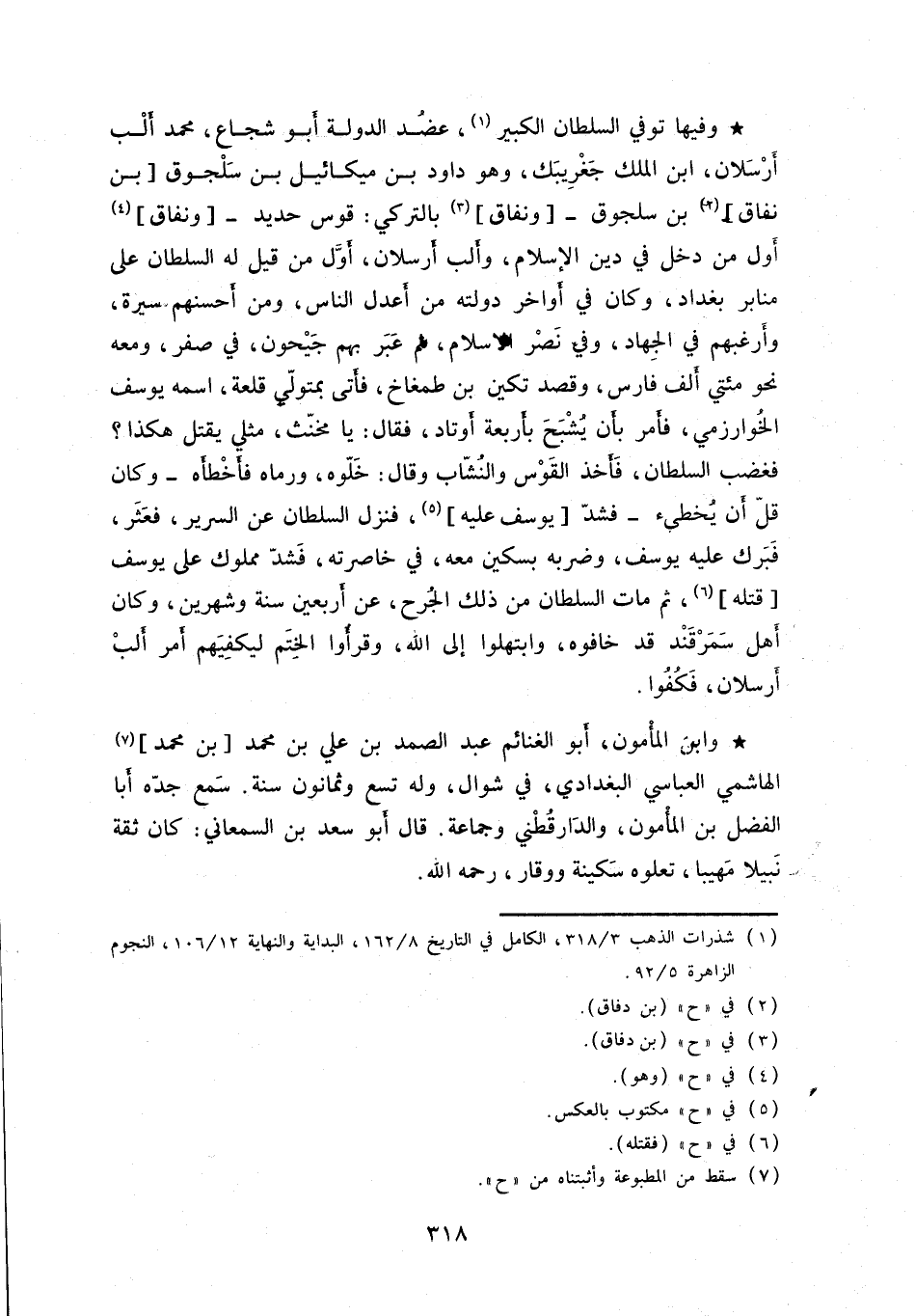 وفيها توفي السلطان الكبير، عضد الدولة أبو شجاع، محمد ألب أرسلان، ابن الملك جغرايبك، وهو داود بن ميكائيل بن سلجوق بن نفاق بن سلجوق - ونفاق بالتركي: قوس حديد - ونفاق أول من دخل في دين الإسلام، وألب أرسلان، أوَّل من قيل له السلطان على منابر بغداد، وكان في أواخر دولته من أعدل الناس، ومن أحسنهم سيرة، وأرغبهم في الجهاد، وفي نصر الإسلام، لم عبر بهم جيحون، في صفر، ومعه نحو مئتي ألف فارس، وقصد تكين بن طمغاخ، فأتى بمتولّي قلعة، اسمه يوسف الخوارزمي، فأمر بأن يشبح بأربعة أوتاد، فقال: يا مخنّث، مثلي يقتل هكذا؟ فغضب السلطان، فأخذ القوس والنشّاب وقال: خلّوه، ورماه فأخطأه - وكان قلّ أن يخطئ - فشدّ يوسف عليه، فنزل السلطان عن السرير، فعثر، فبرك عليه يوسف، وضربه بسكين معه، في خاصرته، فشدّ مملوك على يوسف قتله، ثم مات السلطان من ذلك الجرح، عن أربعين سنة وشهرين، وكان أهل سمرقند قد خافوه، وابتهلوا إلى الله، وقرأوا الختم ليكفيهم أمر ألب أرسلان، فكفوا.