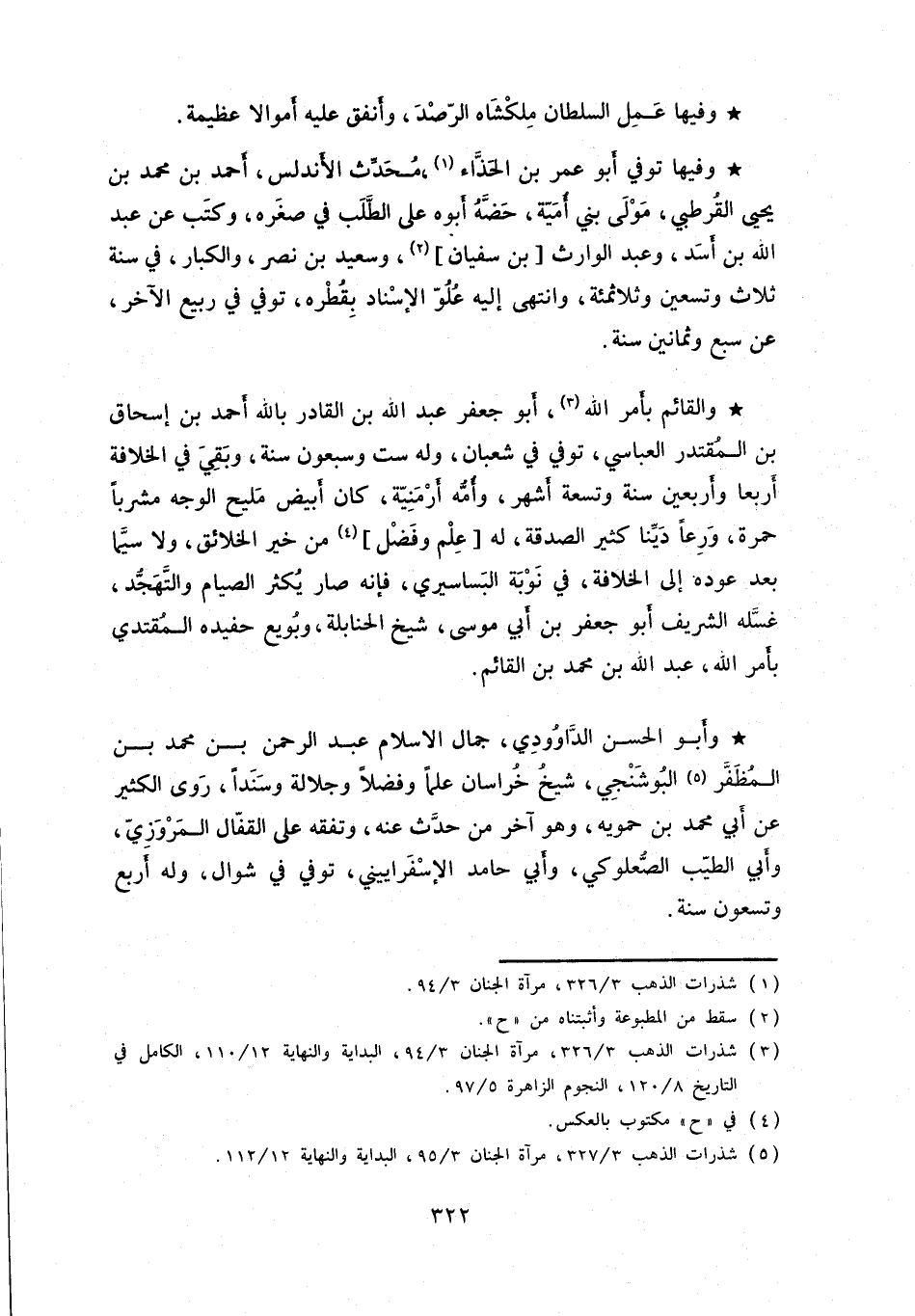 والقائم بأمر الله، أبو جعفر عبد الله بن القادر بالله أحمد بن إسحاق بن المقتدر العباسي، توفي في شعبان، وله ست وسبعون سنة، وبقي في الخلافة أربعاً وأربعين سنة وتسعة أشهر، وأمُّه أرمنيّ ة، كان أبيض مليح الوجه مشرباً حمرة، ورعاً ديِّناً كثير الصدقة، له وفضل من خير الخلائق، ولا سيَّما بعد عوده إلى الخلافة، في نوبة البساسيري، فإنه صار يكثر الصيام والتَّهجُّد، غسَّله الشريف أبو جعفر بن أبي موسى، شيخ الحنابلة، وبويع حفيده المقتدي بأمر الله، عبد الله بن محمد بن القائم.