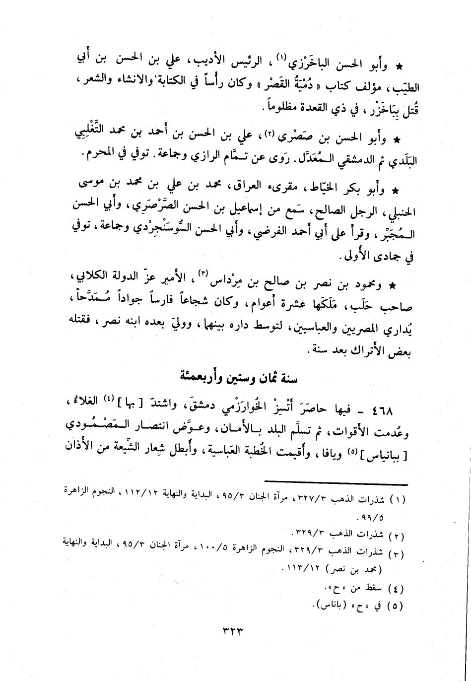 وأبو الحسن الباخرزي، الرئيس الأديب، علي بن الحسن بن أبي الطيّب، مؤلف كتاب " دمية القصر " وكان رأساً في الكتابة والإنشاء والشعر، قتل بباخزر، في ذي القعدة مظلوماً.