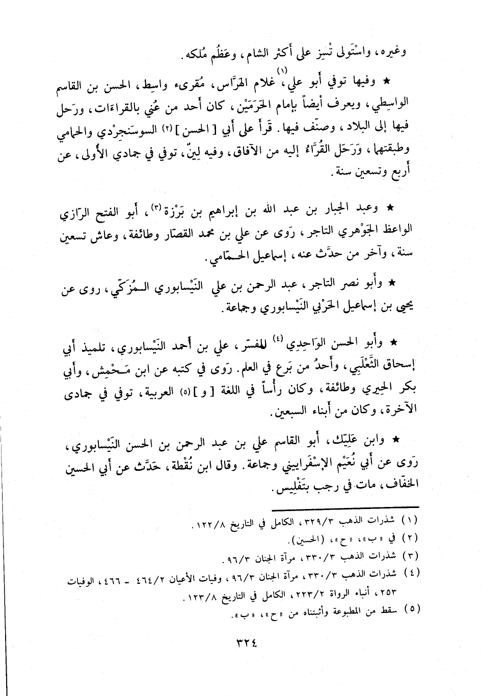 وأبو الحسن الواحدي المفسّر، علي بن أحمد النيسابوري، تلميذ أبي إسحاق الثَّعلبي، وأحد من برع في العلم. روى في كتبه عن ابن محمش، وأبي بكر الحيري وطائفة، وكان رأساً في اللغة والعربية، توفي في جمادى الآخرة، وكان من أنباء السبعين.
