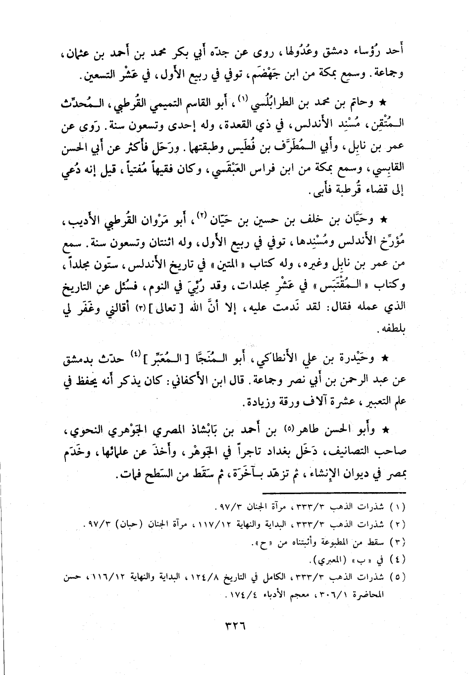 وحيَّان بن خلف بن حسين بن حيّان، أبو مروان القرطبي الأديب، مؤرِّخ الأندلس ومسندها، توفي في ربيع الأول، وله اثنتان وتسعون سنة. سمع من عمر بن نابل وغيره، وله كتاب " المتين " في تاريخ الأندلس، ستّون مجلداً، وكتاب " المقتبس " في عشر مجلدات، وقد رئي في النوم، فسئل عن التاريخ الذي عمله فقال: لقد ندمت عليه، إلا أنَّ الله تعالى أقالني وغفر لي بلطفه.