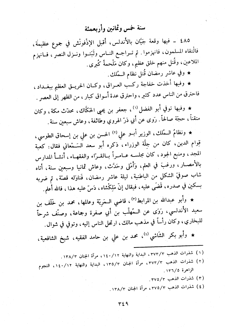 ونظام الملك، الوزير أبو علي الحسن بن علي بن إسحاق الطوسي، قوام الدين، كان من جلَّة الوزراء، ذكره أبو سعد السمعاني فقال: كعبة المجد، ومنبع الجود، كان مجلسه عامراً بالقرّاء والفقهاء، أنشأ المدارس بالأمصار، ورغب في العلم، وأملى وحدَّث، وعاش ثمانياً وسبعين سنة، أتاه شاب صوفيّ الشكل من الباطنية، ليلة عاشر رمضان، فناوله قصّة، ثم ضربه بسكين في صدره، قضى عليه، فيقال إنّ ملكشاه، دسّ عليه هذا، فالله أعلم.