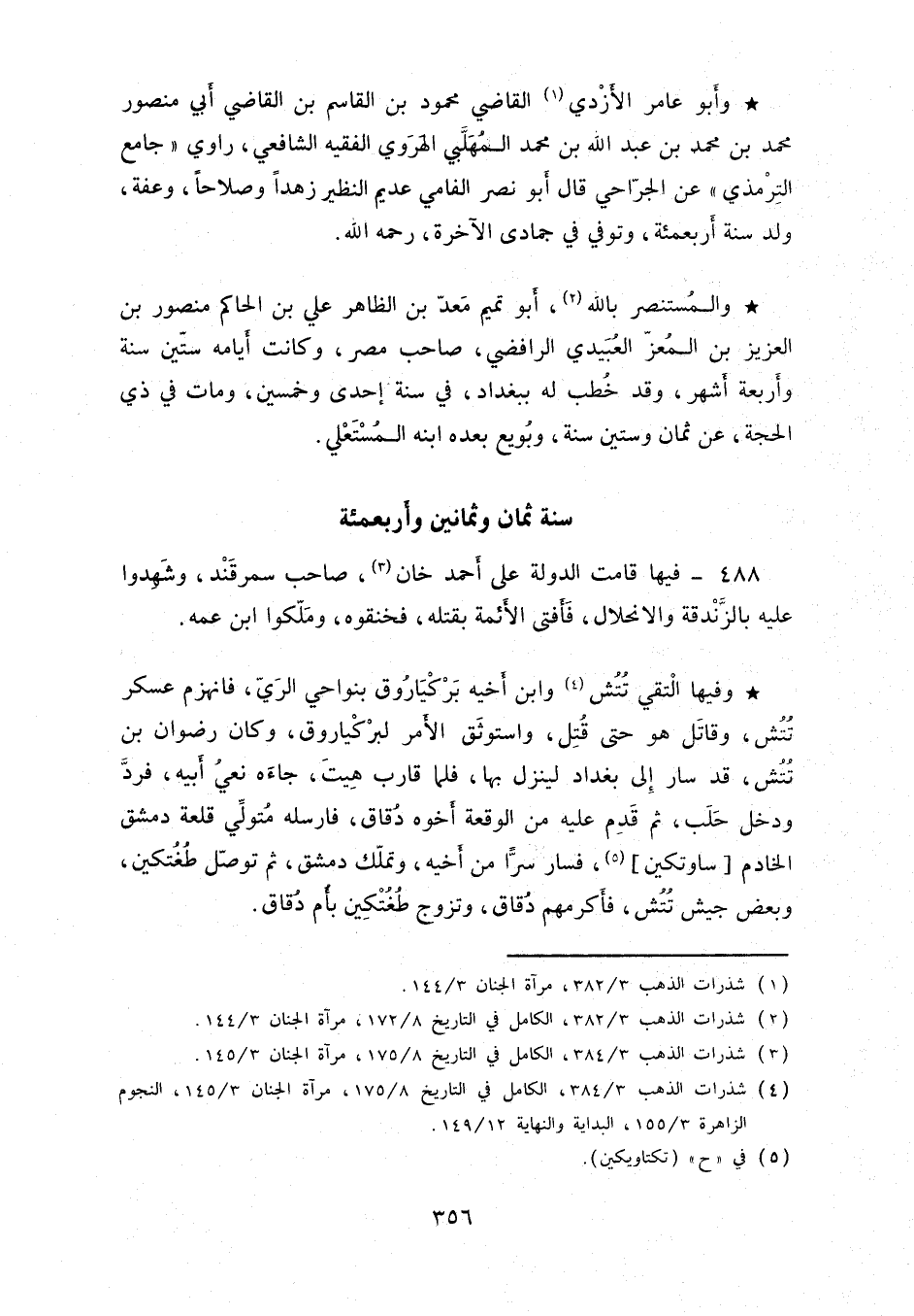 والمستنصر بالله، أبو تميم معدّ بن الظاهر علي بن الحاكم منصور بن العزيز بن المعزّ العبيدي الرافضي، صاحب مصر، وكانت أيامه ستّين سنة وأربعة أشهر،، وقد خطب له ببغداد، في سنة إحدى وخمسين، ومات في ذي الحجة، عن ثمان وستين سنة، وبويع بعده ابنه المستعلي.