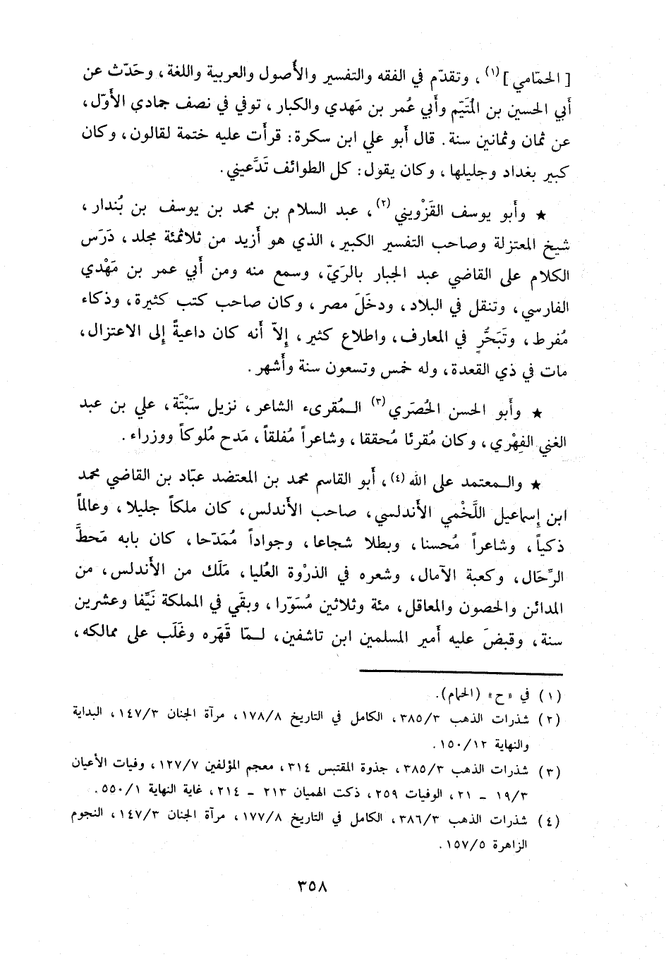 وأبو يوسف القزويني، عبد السلام بن محمد بن يوسف بن بندار، شيخ المعتزلة وصاحب التفسير الكبير، الذي هو أزيد من ثلاثمئة مجلد، درس الكلام على القاضي عبد الجبار بالريّ، وسمع منه ومن أبي عمر بن مهدي الفارسي، وتنقل في البلاد، ودخل مصر، وكان صاحب كتب كثيرة، وذكاء مفرط، وتبحُّرٍ في المعارف، واطلاع كثير، إلاّ أنه كان داعيةً إلى الاعتزال، مات في ذي القعدة، وله خمس وتسعون سنة وأشهر.