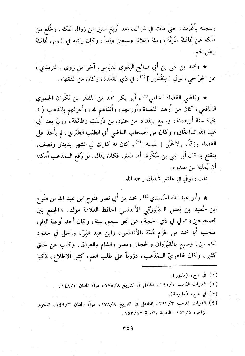 وأبو عبد الله الحميدي، محمد بن أبي نصر فتّوح ابن عبد الله بن فتّوح ابن حميد بن يصل الميورقي الأندلسي الحافظ العلامة مؤلف " الجمع بين الصحيحين " توفي في ذي الحجة، عن نحو سبعين سنة، وكان أحد أوعية العلم، صحب أبا محمد بن حزم مدّة بالأندلس، وابن عبد البرّ، ورحل في حدود الخمسين، وسمع بالقيروان والحجاز ومصر والشام والعراق، وكتب عن خلق كثير، وكان ظاهريّ المذهب، دؤوباً على طلب العلم، كثير الاطلاع، ذكياً