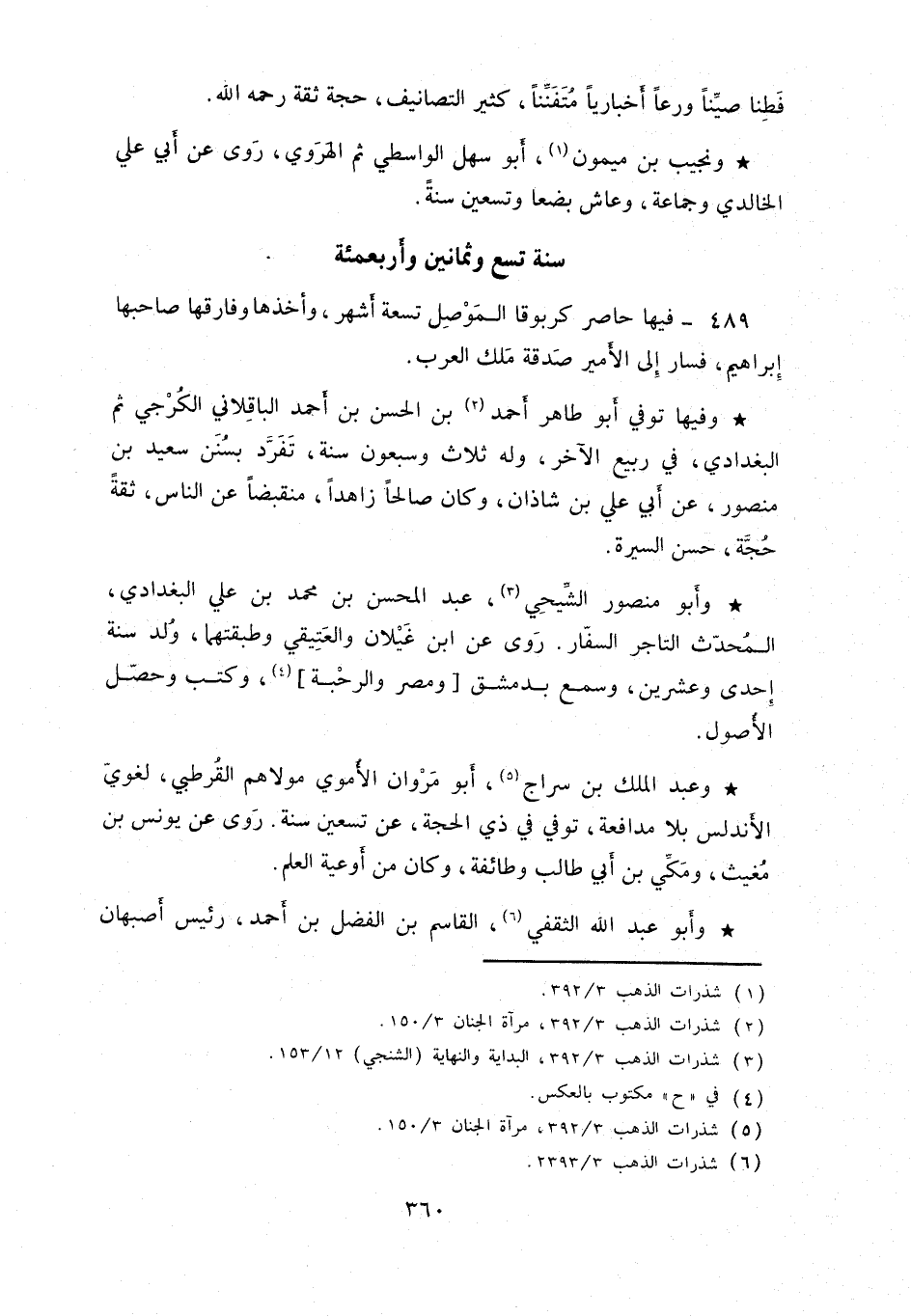 وعبد الملك بن سراج، أبو مروان الأموي مولاهم القرطبي، لغويّ الأندلس بلا مدافعة، توفي في ذي الحجة، عن تسعين سنة. روى عن يونس بن مغيث، ومكِّي بن أبي طالب وطائفة، وكان من أوعية العلم.