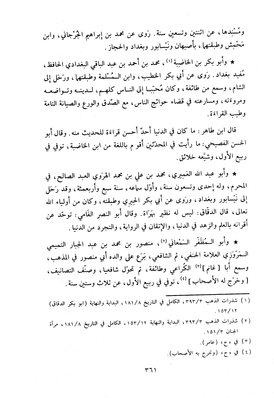 وأبو بكر بن الخاضبة، محمد بن أحمد بن عبد الباقي البغدادي الحافظ، مفيد بغداد. روى عن أبي بكر الخطيب، وابن المسلمة وطبقتهما، ورحل إلى الشام، وسمع من طائفة، وكان محبّباً إلى الناس كلهم، لدينه وتواضعه ومروءته، ومسارعته في قضاء حوائج الناس، مع الصِّق والورع والصيانة التامة وطيب القراءة.