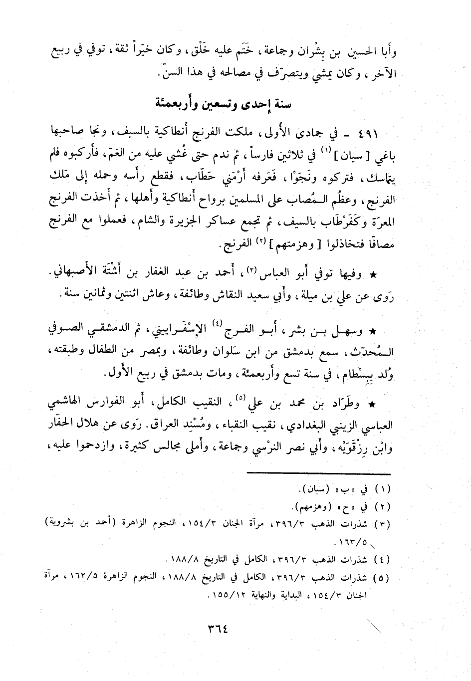 في جمادى الأولى، ملكت الفرنج أنطاكية بالسيف، ونجا صاحبها باغي سيان في ثلاثين فارساً، ثم ندم حتى غشي عليه من الغمّ، فأركبوه فلم يتماسك، فتركوه ونجوا، فعرفه أرمني حطّاب، فقطع رأسه وحمله إلى ملك الفرنج، وعظم المصاب على المسلمين برواح أنطاكية وأهلها، ثم أخذت الفرنج المعرّة وكفرطاب بالسيف، ثم تجمع عساكر الجزيرة والشام، فعملوا مع الفرنج مصافّاً فتخاذلوا وهزمتهم الفرنج.