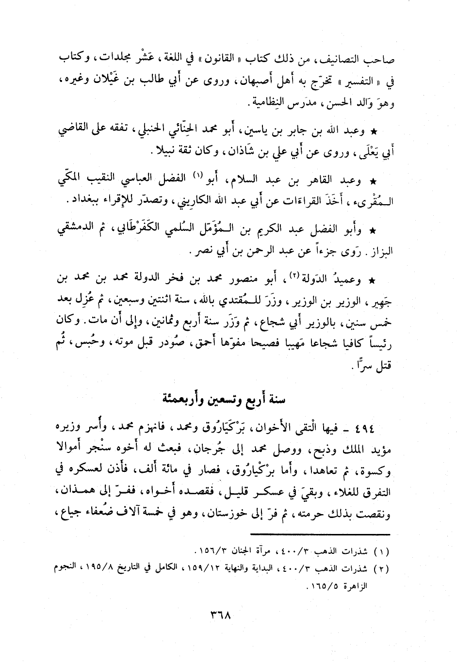 وعميد الدولة، أبو منصور محمود بن فخر الدولة محمد بن محمد بن جهير، الوزير، وزر للمقتدي بالله، سنة اثنتين وسبعين، ثم عزل بعد خمس سنين، بالوزير أبي شجاع، ثم وزر سنة أربع وثمانين، وإلى أن مات. وكان رئيساً كافياً شجاعاً مهيباً فصيحاً مفوّهاً أحمق، صودر قبل موته، وحبس، ثم قتل سرّاً.