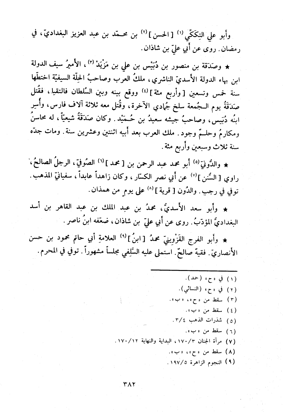 وصدقة بن منصور بن دبيس بن علي بن مزيد، الأمير سيف الدولة ابن بهاء الدولة الأسديّ الناشري، ملك العرب وصاحب الحلّة السيفيّة اختطّها سنة خمس وتسعين وأربع مئة ووقع بينه وبين السلطان فالتقيا، فقتل صدقة يوم الجمعة سلخ حمادي الآخرة، وقتل معه ثلاثة آلاف فارس، وأسر ابنه دبيس، وصاحب جيشه سعيد بن حميد. وكان صدقة شيعيّاً، له محاسن ومكارم وحلمٌ وجود. ملك العرب بعد أبيه اثنتين وعشرين سنة. ومات جدّه سنة ثلاث وسبعين وأربع مئة.