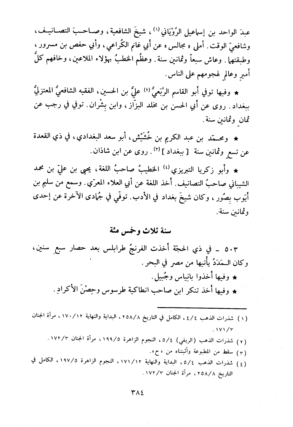 عبد الواحد بن إسماعيل الروياني، شيخ الشافعية، وصاحب التصانيف وشافعيّ الوقت. أملى " مجالس " عن أبي غانم الكراعي، وأبي حفص بن مسرور، وطبقتهما وعاش سبعاً وثمانين سنة. وعظم الخطب بهؤلاء الملاعين وخافهم كلُّ أمير وعالمٍ لهجومهم على الناس.