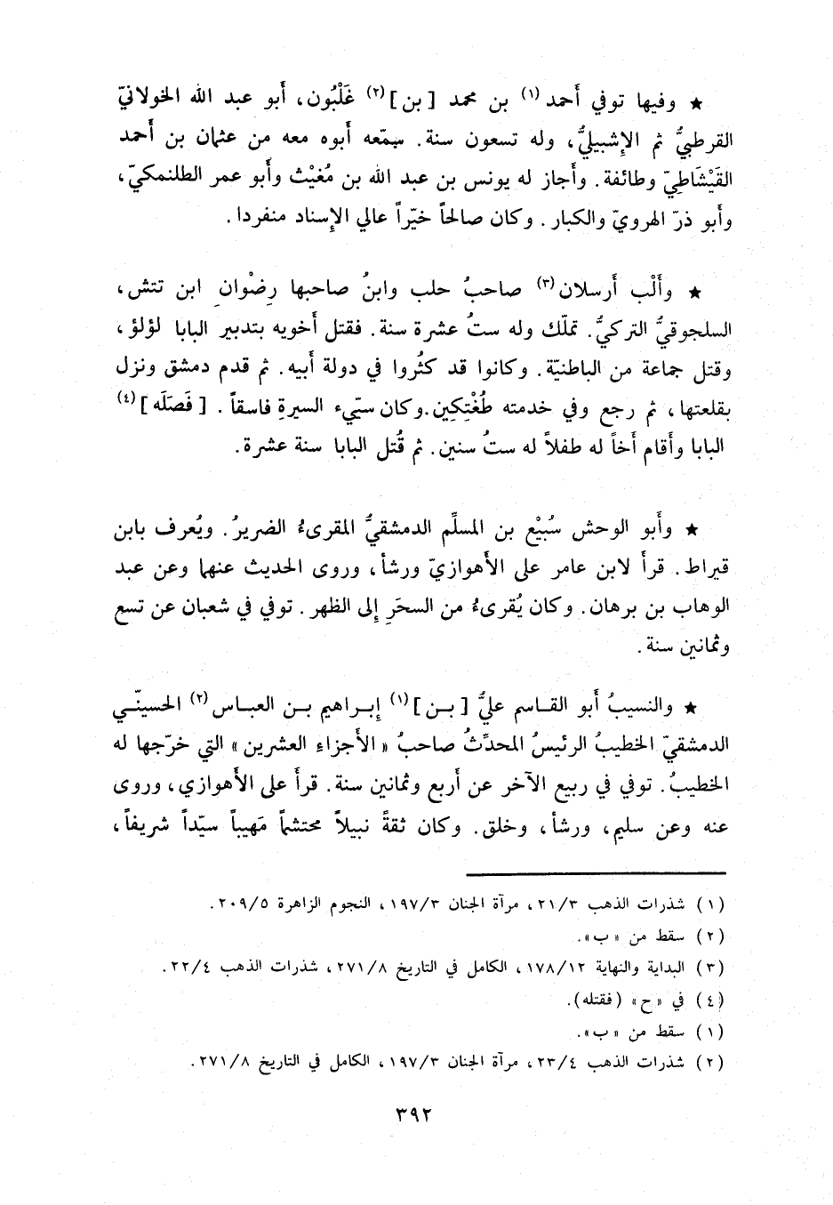 وألب أرسلان صاحب حلب وابن صاحبها رضوان ابن تتش، السلجوقيُّ التركيُّ. تملّك وله ست عشرة سنة. فقتل أخويه بتدبير الباب لؤلؤ، وقتل جماعة من الباطنيّة. وكانوا قد كثروا في دولة أبيه. ثم قدم دمشق ونزل بقلعتها، ثم رجع وفي خدمته طغتكين. وكان سيّيء السيرة فاسقاً. فصله البابا وأقام أخاً له طفلاً له ست سنين. ثم قتل البابا سنة عشرة.