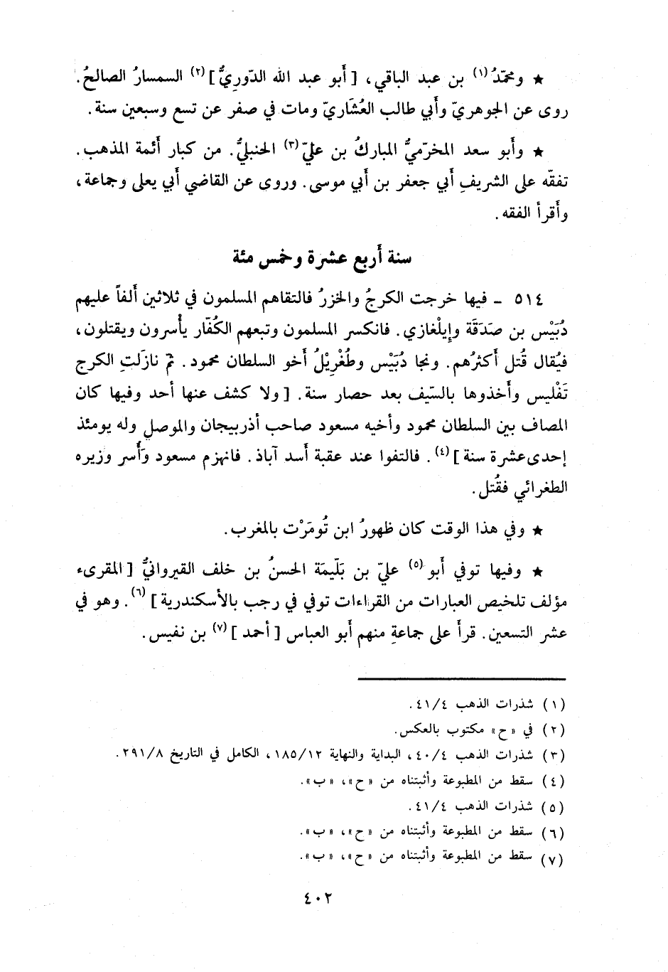 فيها خرجت الكرج والخزر فالتقاهم المسلمون في ثلاثين ألفاً عليهم دبيس بن صدقة وإيلغازي. فانكسر المسلمون وتبعهم الكفّار يأسرون ويقتلون، فيقال قتل أكثرهم. ونجا دبيس وطغريل أخو السلطان محمود. ثمّ نازلت الكرج تفليس وأخذوها بالسيّف بعد حصار سنة. ولا كشف عنها أحد وفيها كان المصاف بين السلطان محمود وأخيه مسعود صاحب أذربيجان والموصل وله يومئذ إحدى عشرة سنة. فالتفوا عند عقبة أسد آباذ. فانهزم مسعود وأسر وزيره الطغرائي فقتل.