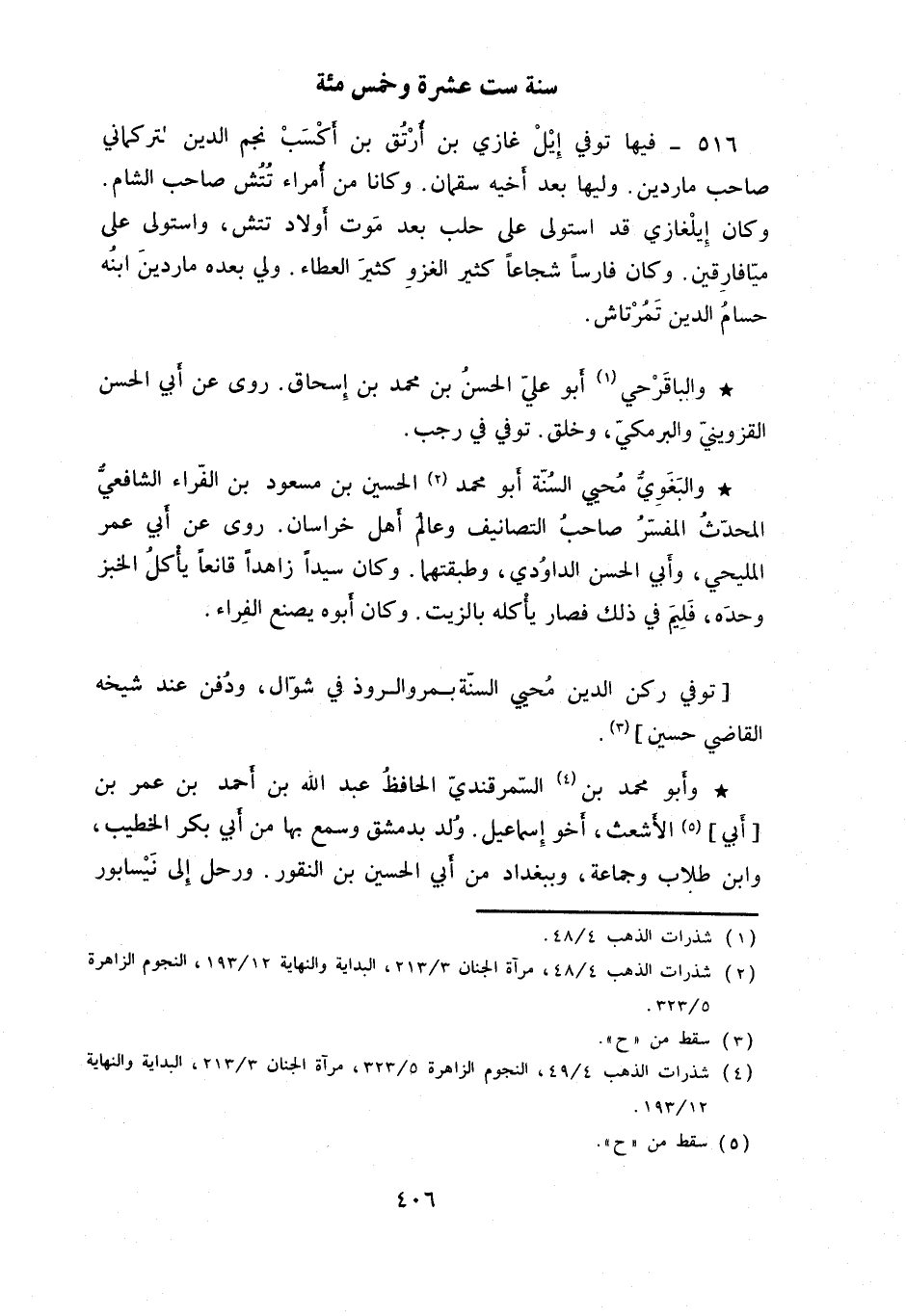 والبغويُّ محيي السنّة أبو محمد الحسين بن مسعود بن الفّراء الشافعيُّ المحدّث المفسّر صاحب التصانيف وعالم أهل خراسان. روى عن أبي عمر المليحي، وأبي الحسن الداودي، وطبقتهما. وكان سيداً زاهداً قانعاً يأكل الخبز وحده، فليم في ذلك فصار يأكله بالزيت. وكان أبه يصنع الفراء.