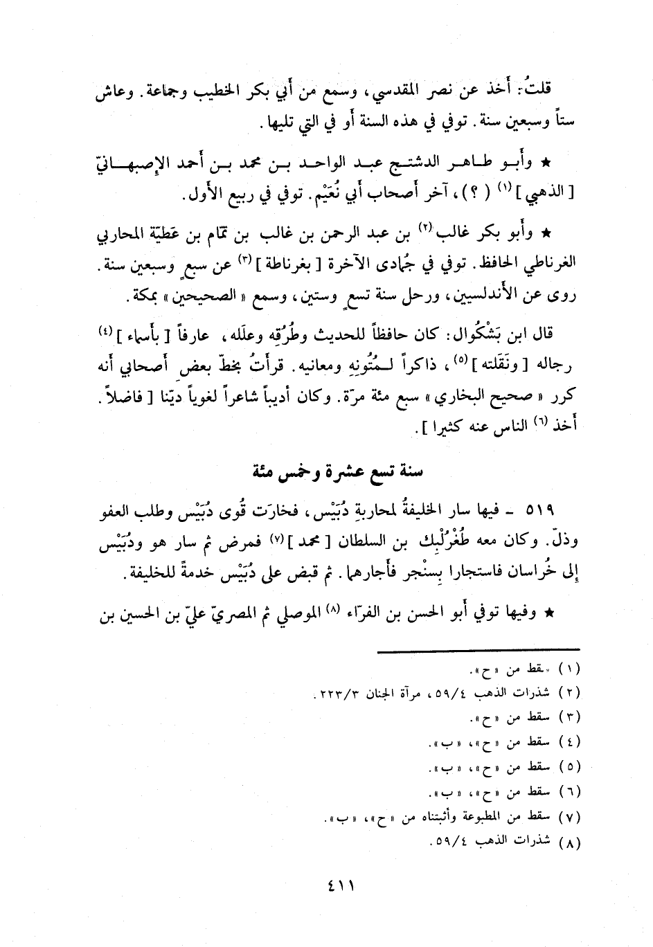 وأبو طاهر الشيخ عبد الواحد بن محمد بن أحمد الأصبهاني الذهبي آخر أصحاب أبو نعيم توفي في ربيع الأول.