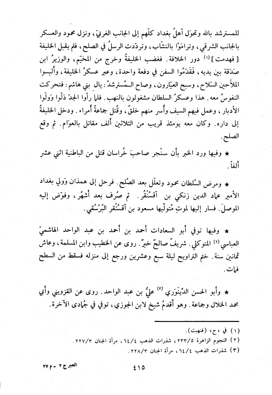 وفيها توفي أبو السعادات أحمد بن أحمد بن عبد الواحد الهاشميّ العباسي المتوكلي. شريفٌ صالحٌ خيرٌ. روى عن الخطيب وابن المسلمة، وعاش ثمانين سنة. ختم التراويح ليلة وعشرين ورجع إلى منزله فسقط من السطح فمات.