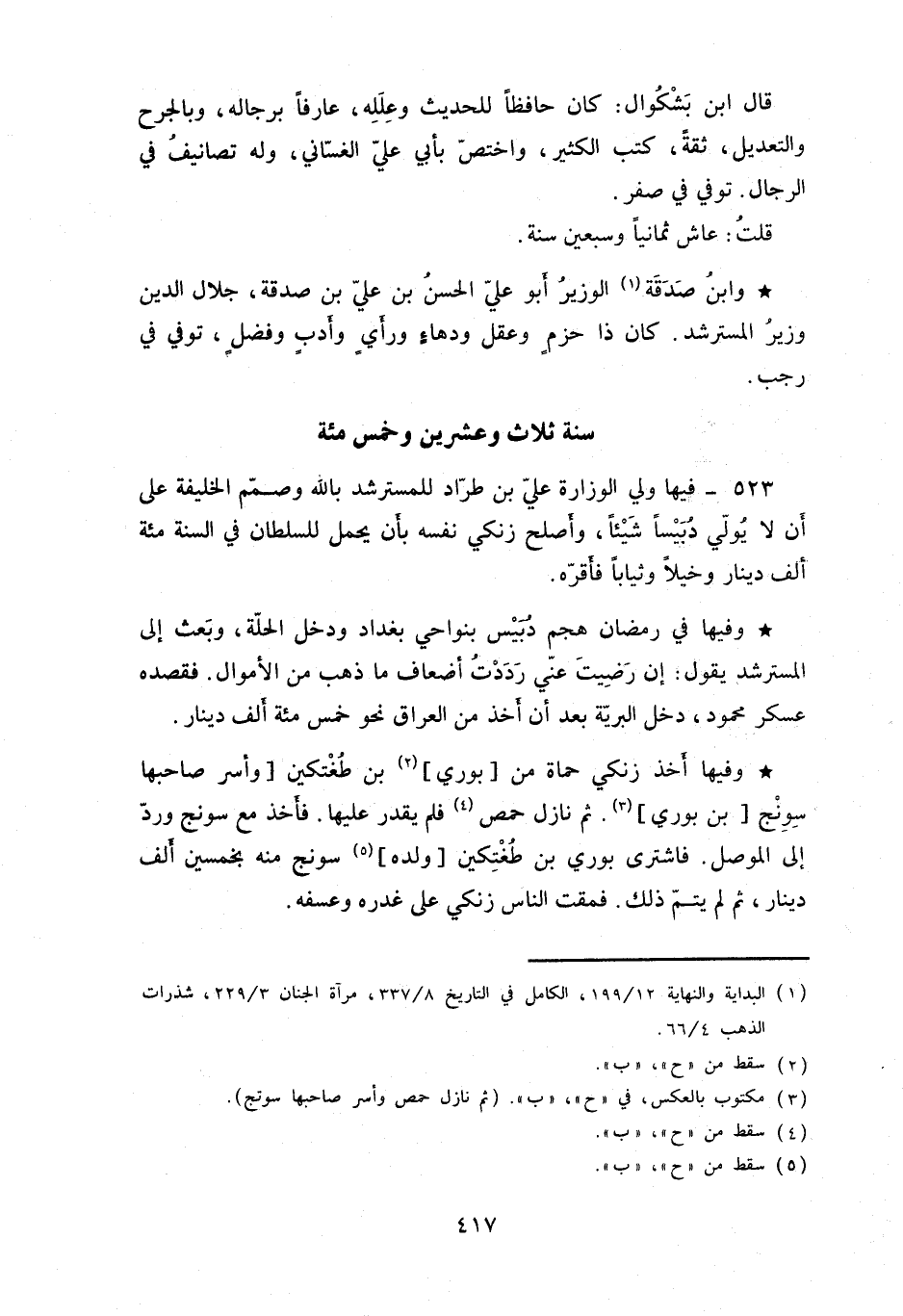 فيها ولي الوزارة عليّ بن طرّاد للمسترشد بالله وصمّمم الخليفة على أن لا يوليّ دبيساً شيئاً، وأصلح زنكي نفسه بأن يحمل للسلطان في السنة مئة ألف دينار وخيلاً وثياباً فأقرّه.