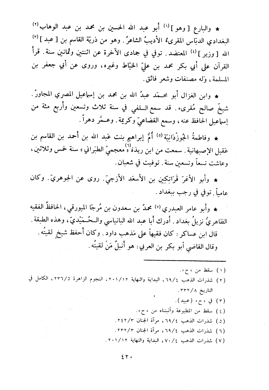 والبارع وهو أبو عبد الله الحسين بن محمد بن عبد الوهاب البغدادي الدبّاس المقرئ الأديب الشاعر. وهو من ذريّة القاسم بن عبد الله وزير المعتضد. توفي في جمادى الآخرة عن اثنتين وثمانين سنة. قرأ القرآن على أبي بكر محمد بن عليّ الخيّاط وغيره، وروى عن أبي جعفر بن المسلمة، وله مصنفات وشعر فائق.