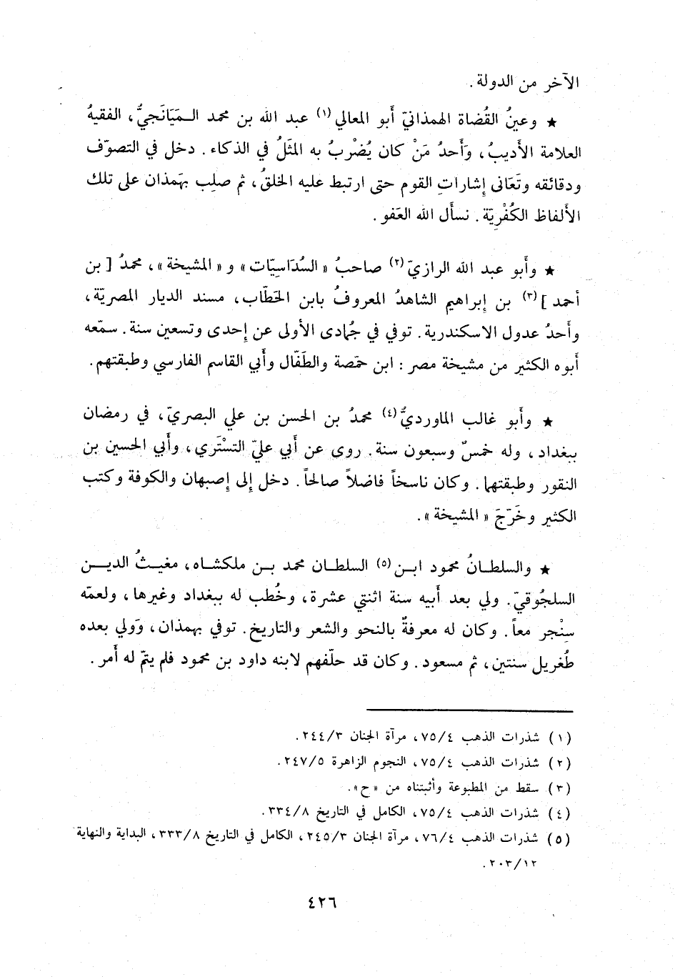 وعين القضاة الهمذانيّ أبو المعالي عبد الله بن محمد الميانجيُّ، الفقيه العلامة الأديب، وأحد من كان يضرب به المثل في الذكاء. دخل في التصوّف ودقائقه وتعانى إشارات القوم حتى ارتبط عليه الخلق، ثم صلب بهمذان على تلك الألفاظ الكفريّة. نسأل الله العفو.