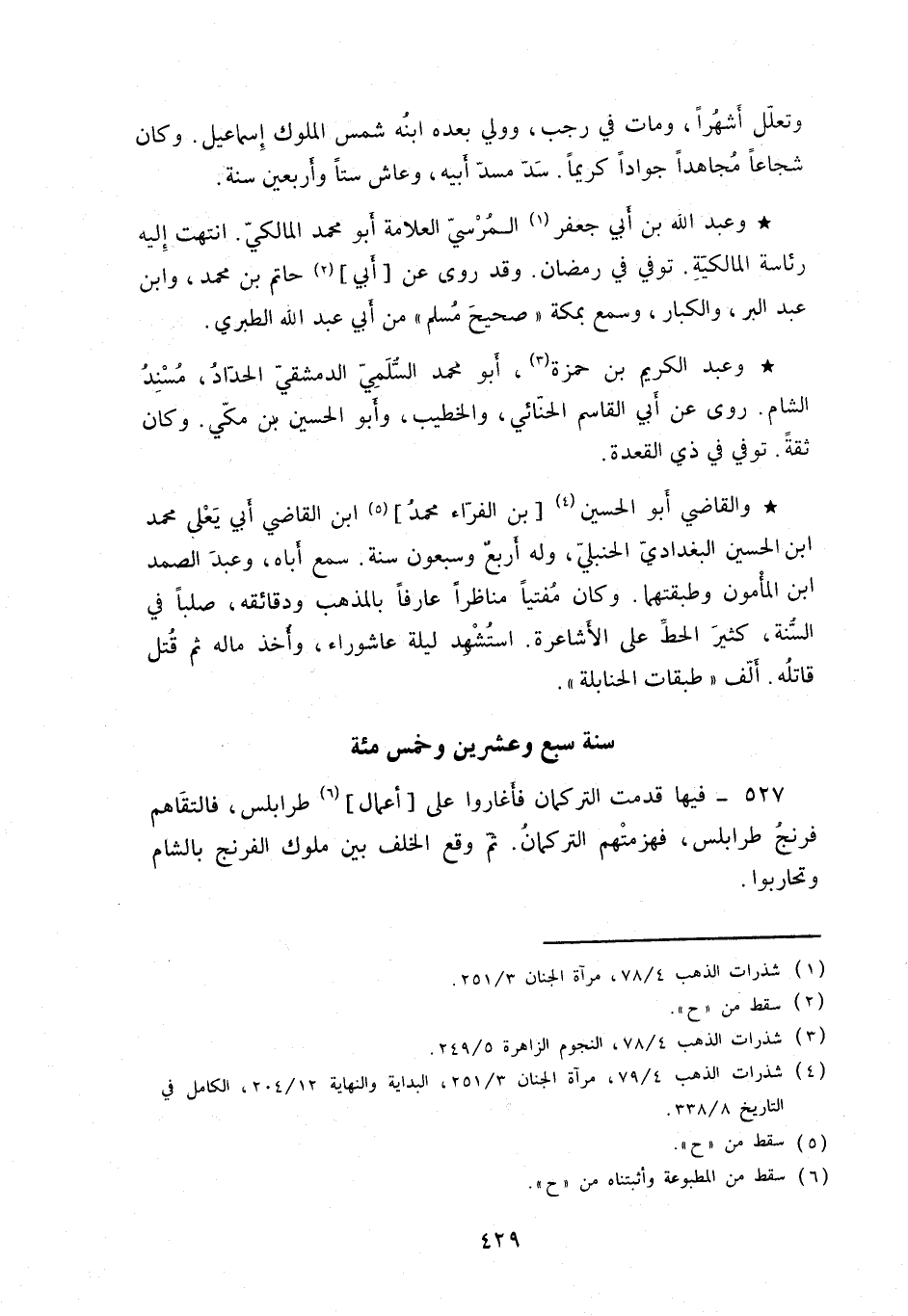والقاضي أبو الحسين بن الفرّاء محمد ابن القاضي أبي يعلى محمد ابن الحسين البغدادي الحنبليّ، وله أربعٌ وسبعون سنة. سمع أباه، وعبد الصمد ابن المأمون وطبقتهما. وكان مفتياً مناظراً عارفاً بالمذهب ودقائقه، صلباً في السُّنة، كثير الحطِّ على الأشاعرة. استشهد ليلة عاشوراء، وأخذ ماله ثم قتل قاتله. ألّف " طبقات الحنابلة ".