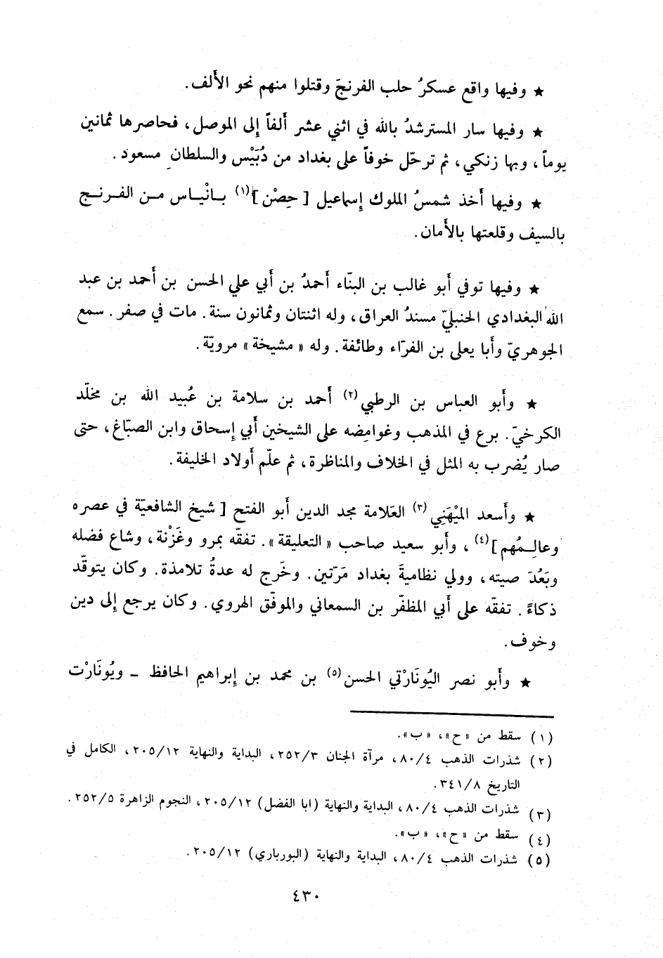 وفيها سار المسترشد بالله في اثني عشر ألفاً إلى الموصل، فحاصرها ثمانين يوماً، وبها زنكي، ثم ترحّل خوفاً على بغداد من دبيس والسلطان مسعود.