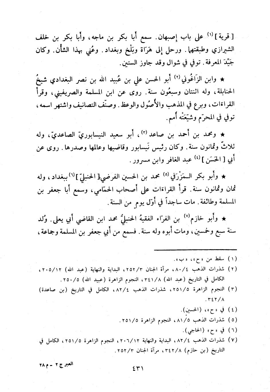 وأبو بكر المزرفي محمد بن الحسين الفرضي الحنبليّ ببغداد، وله ثمان وثمانون سنة. قرأ القراءات على أصحاب الحمّامي، وسمع أبا جعفر بن المسلمة وطائفة. مات ساجداً في أوّل يومٍ من السنة.