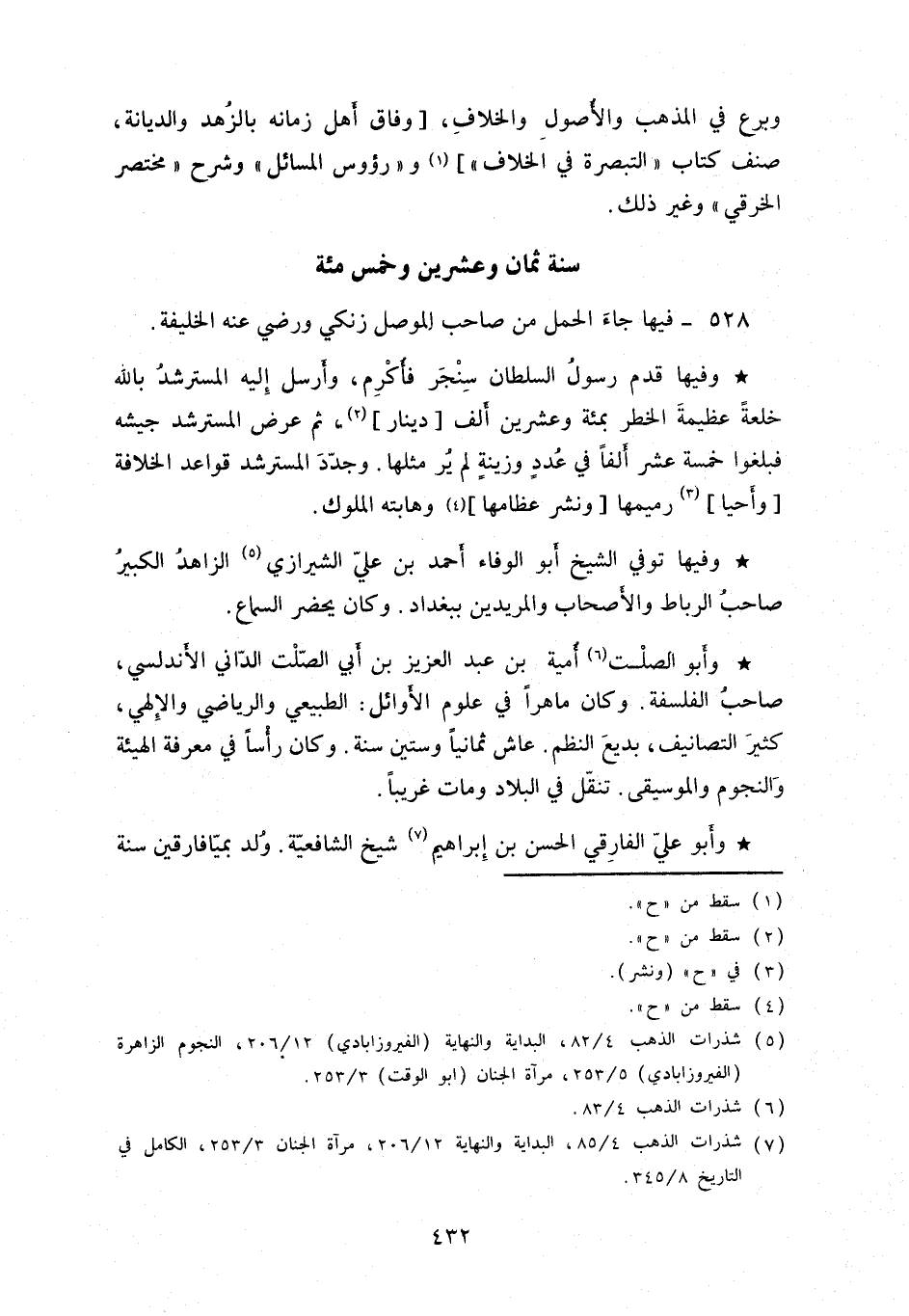 وفيها قدم رسول السلطان سنجر فأكرم، وأرسل إليه المسترشد بالله خلفه عظيمة الحظر بمئة وعشرين ألف دينار ثم عرض المسترشد جيشه فبلغوا خمسة عشر ألفاً في عددٍ وزينةٍ لم ير مثلها. وجدّد المسترشد قواعد الخلافة وأحي رميمها ونشر عظامها وهابته الملوك.