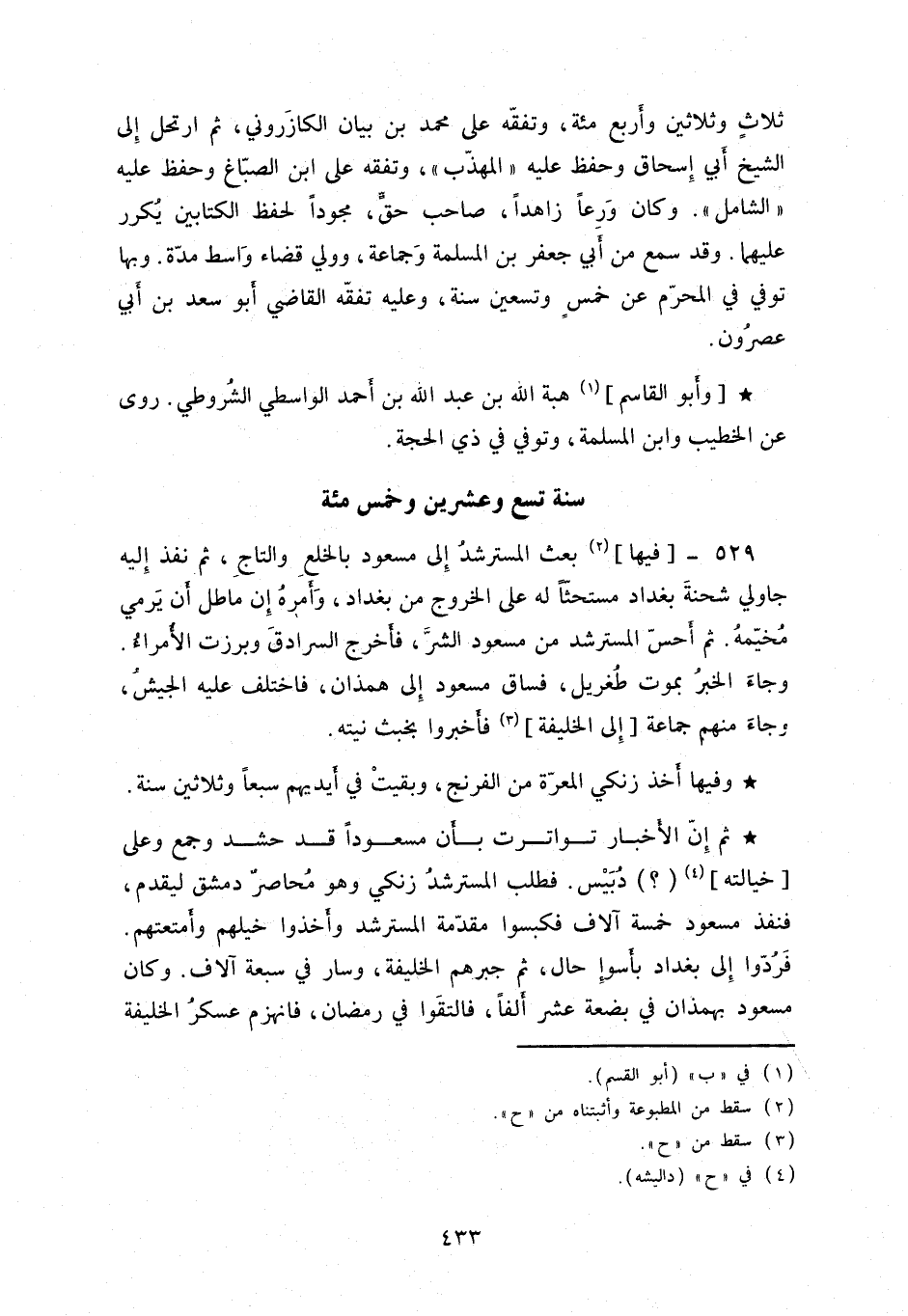 ثلاثٍ وثلاثين وأربع مئة، وتفقّه على محمد بن بيان الكازوني، ثم ارتحل إلى الشيخ أبي إسحاق وحفظ عليه " المهذّب " وتفقه على ابن الصبّاغ، وحفظ عليه " الشامل ". وكان ورعاً زاهداً، صاحب حقٍّ، مجوداً لحفظ الكتابين يكرر عليهما. وقد سمع من أبي جعفر بن المسلمة وجماعة، وولي قضاء واسط مدّة. وبها توفي في المحرّم عن خمسٍ وتسعين سنة، وعليه تفقّه القاضي أبو سعد بن أبي عصرون.