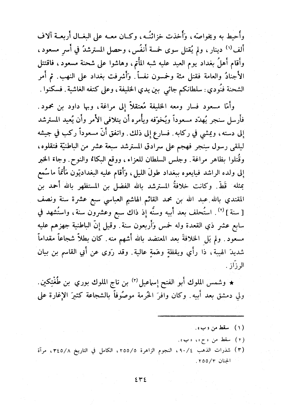 فأرسل سنجر يهدّد مسعوداً ويخوّفه وأمره أن يتلافى الأمر وأن يعيد المسترشد إلى دسته، ويمشي في ركابه. فسارع إلى ذلك. واتفق أنّ مسعوداً ركب في جيشه ليلقى بظاهر مراغة. وجلس السلطان للعزاء، ووقع البكاء والنوح. وجاء الخبر إلى ولده الراشد فيايعوه ببغداد طول الليل، وأقام عليه البغداديّون مأتماً ما سمع بمثله قطّ. وكانت خلافة المسترشد بالله الفضل بن المستظهر بالله أحمد بن المقتدي بالله عبد الله بن محمد القائم الهاشيم العباسي سبع عشرة سنة ونصف سنة. استحلف بعد أبيه وسنُّ إذ ذاك سبع وعشرون سنة، واستشهد في سابع عشر ذي القعدة وله خمس وأربعون سنة. وقيل إنّ الباطنية جهزهم عليه مسعود. ولم يل الخلافة بعد المعتضد بالله أشهم منه. كان بطلاً شجاعاً مقداماً شديد الهيبة، ذا رأي ويقظةٍ وهمةٍ عالية. وقد روى عن أبي القاسم بن بيان الرزّاز.