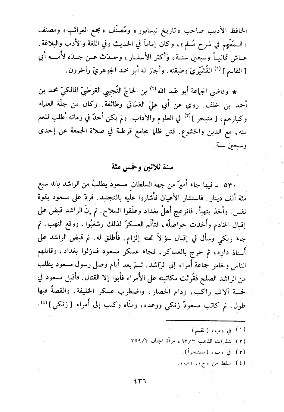 فيها جاء أميرٌ من جهة السلطان مسعود يطلب من الراشد بالله سبع مئة ألف دينار. فاستشار الأعيان فأشاروا عليه بالتجنيد. فردّ على مسعود بقوة نفس. وأخذ يتهيأ. فانزعج أهل بغداد وعلّقوا السلاح. ثم إنّ الراشد قبض على إقبال الخادم وأخذت حواصله، فتألّم العسكر لذلك وشغبوا، ووقع النهب. ثم جاء زنكي وسأل في إقبال سؤالاً تحته إلزام. فأطلق له. ثم قبض الراشد على أستاذ داره، ثم خرج بالعساكر، فجاء عسكر مسعود فنازلوا بغداد، وقاتلهم الناس وخامر جماعة أمراء إلى الراشد. ثمّ بعد أيام وصل رسول مسعود يطلب من الراشد الصلح فقرئت مكاتبته على الأمراء فأبوا إلا القتال. فأقبل مسعود في خمسة آلاف راكب، ودام الحصار، واضطرب عسكر الخليفة، والقصة فيها طول. ثم كاتب مسعودٌ زنكي ووعده، ومنّاه وكتب إلى أمراء زنكي.