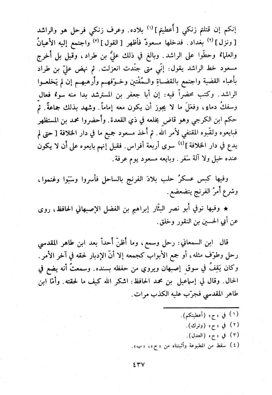 إنكم إن قتلتم زنكي أعطيتم بلاده. وعرف زنكي فرحل هو والراشد ونزل بغداد. فدخلها مسعودٌ فأظهر القول واجتمع إليه الأعيان والعلماء وحطّوا على الراشد. وبالغ في ذلك عليُّ بن طراد، وقيل بل أخرج مسعود خط الراشد يقول إني متى جندت انعزلت ثم نهض علي بن طراد بأعباء القضية واجتمع بالقضاة والمفتين وخوّفهم وأرهبهم إن لم يخلعوا الراشد. وكتب محضراً فيه: إن أبا جعفر بن المسترشد بدا منه سوء فعالٍ وسفك دماءٍ، وفعل مالا يجوز أن يكون معه إماماً. وشهد بذلك جماعةٌ. ثم حكم ابن الكرجي وهو قاضٍ بخلعه في ذي القعدة. وأحضروا محمد بن المستظهر فبايعوه ولقّبوه المقتفي لأمر الله. ثم أخذ مسعود جميع ما في دار الخلافة حتى لم يدع في دار الخلافة سوى أربعة أفراس. فقيل إنهم بايعوه على أن لا يكون عنده خيل ولا آلة سفر. وبايعه مسعود يوم عرفة.