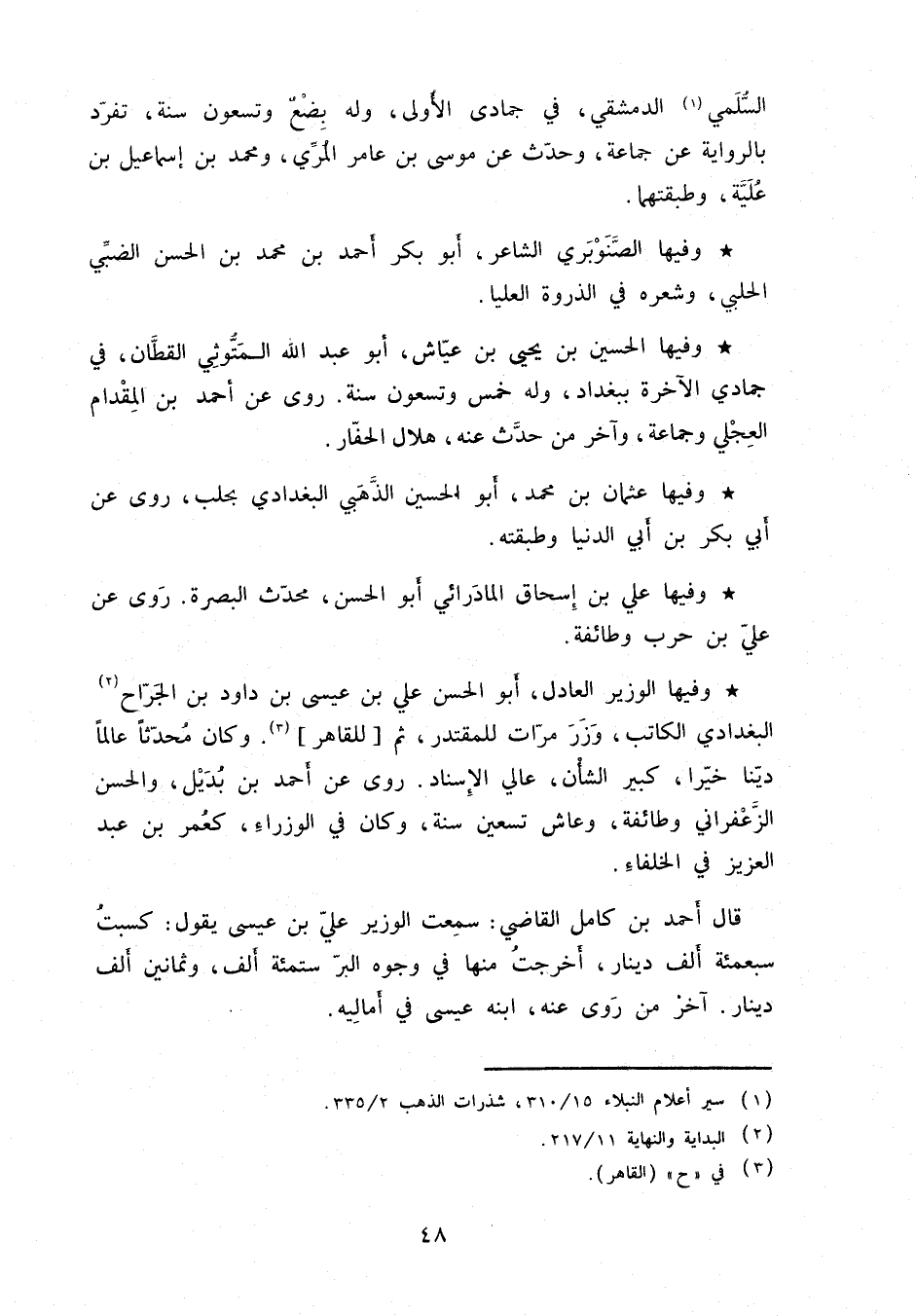 وفيها الوزير العادل، أبو الحسن علي بن عيسى بن داود بن الجرّاح البغدادي الكاتب، وزر مرّات للمقتدر، ثم للقاهر. وكان محدّثاً عالماً ديّنا حيّرا، كبير الشأن، عالي الإسناد. روى عن أحمد بن بديل، والحسن الزَّعفراني وطائفة، وعاش تسعين سنة، وكان في الوزراء، كعمر بن بن عبد العزيز في الخلفاء.