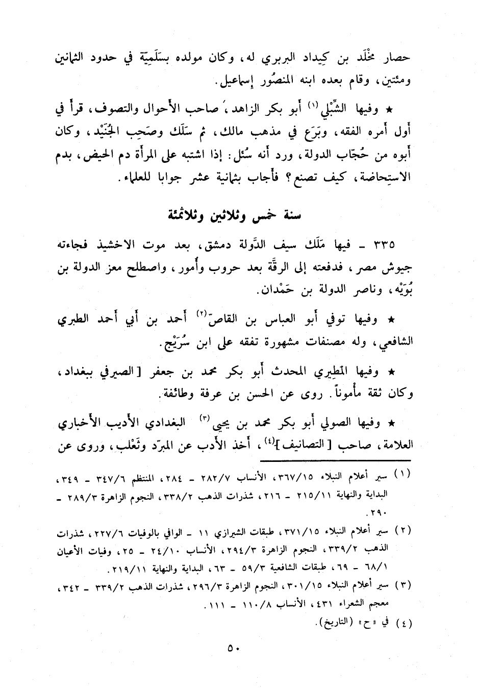 وفيها الشَّبلي أبو بكر الزاهد، صاحب الأحوال والتصوف، قرأ في أول أمره الفقه، وبرع في مذهب مالك، ثم سلك وصحب الجنيد، وكان أبوه من حجّاب الدولة، ورد أنه سئل: إذا اشتبه على المرأة دم الحيض، بدم الاستحاضة، كيف تصنع؟ فأجاب بثمانية عشر جواباً للعلماء.