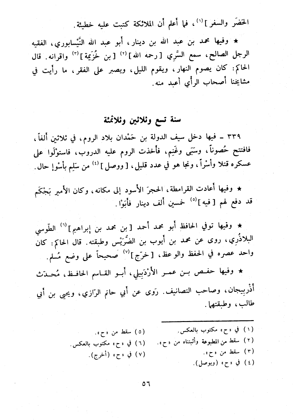 وفيها محمد بن عبد الله بن دينار، أبو عبد الله النَّيسابوري، الفقيه الرجل الصالح، سمع السَّري رحمه الله بن خزيمة واقرانه. قال الحاكم: كان يصوم النهار، ويقوم الليل، ويصبر عل الفقر، ما رأيت في مشايخنا أصحاب الرأي أعبد منه.
