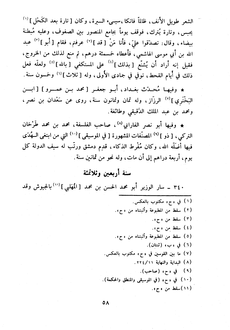 وفيها أبو نصر الفارابي، صاحب الفلسفة، محمد بن محمد طرخان التركي، ذو المصنّفات المشهورة في الموسيقى التي من ابتغى الهدى فيها أضلّه الله، وكان مفرط الذكاء، قدم دمشق ورتّب له سيف الدولة كل يوم، أربعة دراهم إلى أن مات، وله نحو من ثمانين سنة.