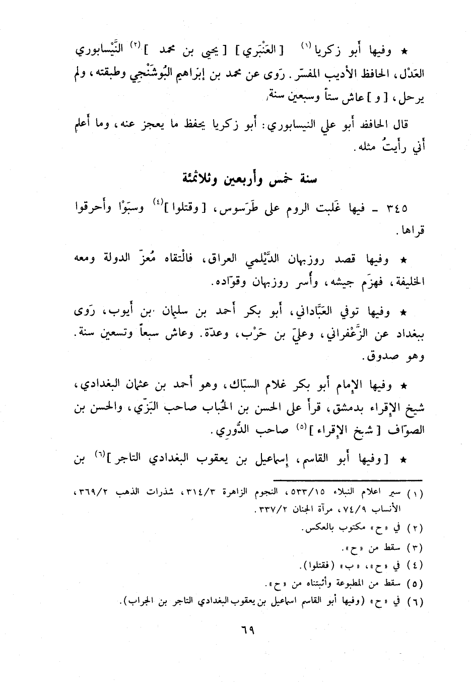 وفيها أبو زكريا العنبري يحيى بن محمد النَّيسابوري العدل، الحافظ الأديب المفسّر. روى عن محمد بن إبراهيم البوشنجي وطبقته، ولم يرحل، وعاش ستاً وسبعين سنة.