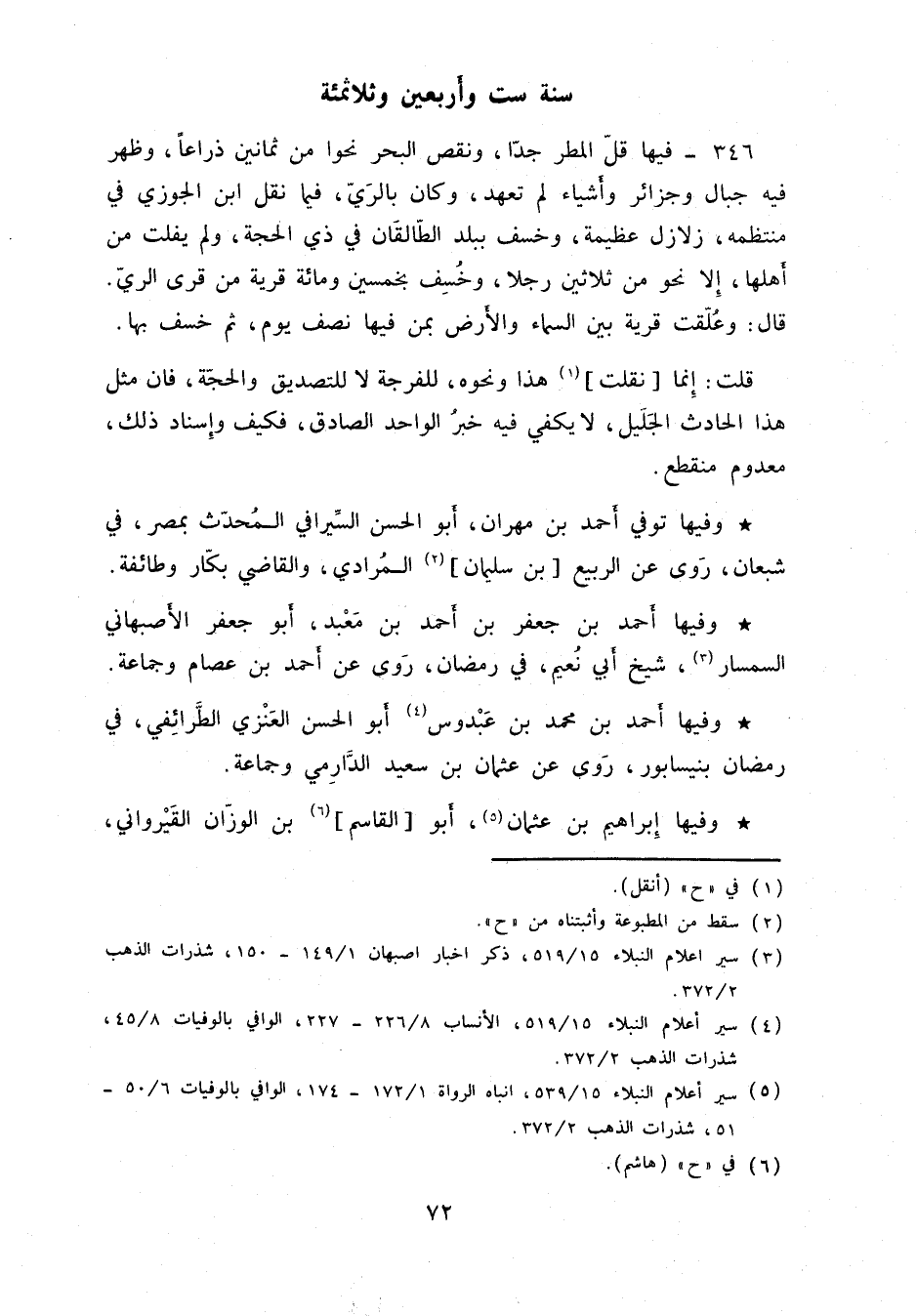 فيها قلّ المطر جدّا، ونقص البحر نحوا من ثمانين ذراعاً، وظهر فيه جبال وجزائر وأشياء لم تعهد، وكان بالريّ، فيما نقل ابن الجوزي في منتظمه، زلازل عظيمة، وخسف ببلد الطّالقان في ذي الحجة، ولم يفلت من أهلها، إلا نحو من ثلاثين رجلاً، وخسف بخمسين ومائة قرية من قرى الريّ.