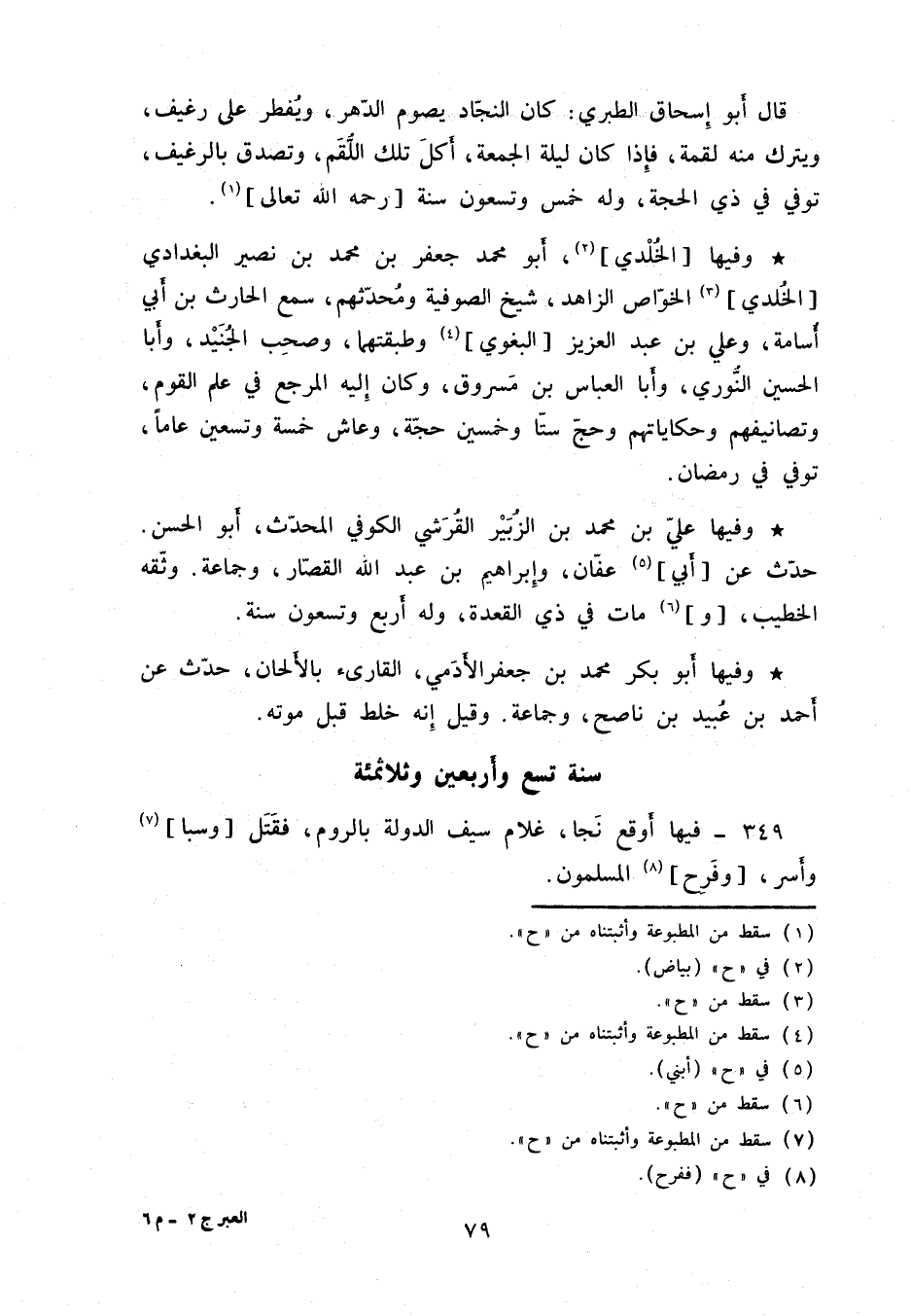 وفيها الخلدي، أبو محمد بن جعفر بن محمد بن نصير البغدادي الخلدي الخوّاص الزاهد، شيخ الصوفية ومحدّثهم، سمع الحارث بن أبي أسامة، وعلي بن عبد العزيز البغوي وطبقتهما، وصحب الجنيد، وأبا الحسين النُّوري، وأبا العباس بن مسروق، وكان إليه المرجع في علم القوم، وتصانيفهم وحكاياتهم وحجّ ستاً وخمسين حجّة، وعاش خمسة وتسعين عاماً، توفي في رمضان.