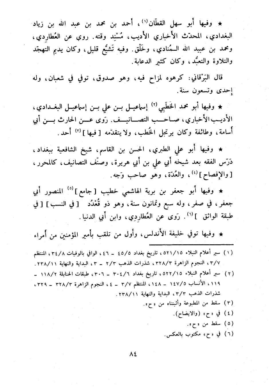 وفيها أبو سهل القطّان، أحمد بن محمد بن عبد الله بن زياد البغدادي، المحدّث الأخباري الأديب، مسند وقته. روى عن العطاردي، ومحمد بن عبيد الله المنادي، وخلق. وفيه تشيُّع قليل، وكان يديم التهجّد والتلاوة والتعبُّد، وكان كثير الدعابة.